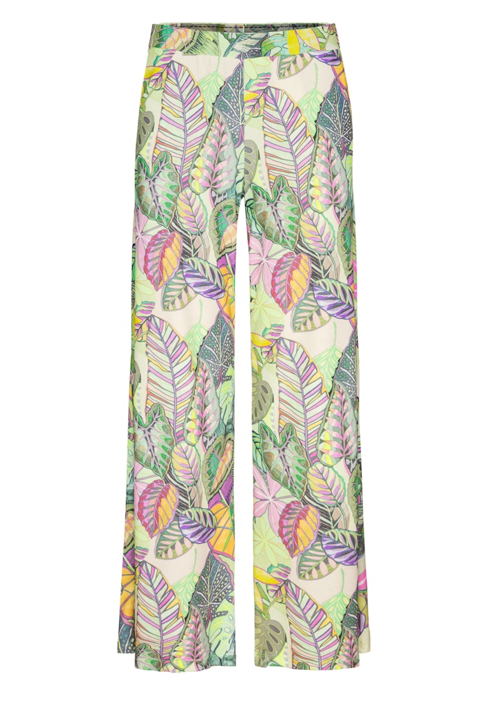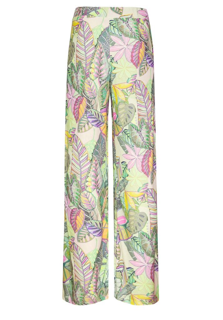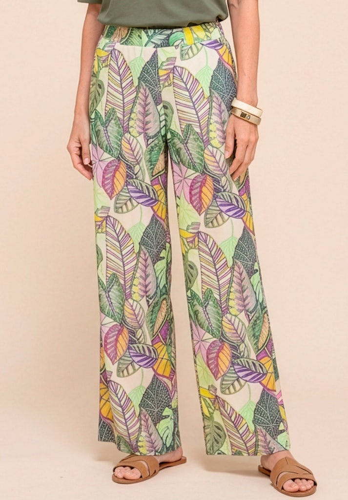 Deze slip-on broek scoort met een trendy bladprint in een trendy kleur en een casual brede pasvorm. De elastische tailleband en zijzakken zorgen voor comfort en versterken de ontspannen uitstraling. De hoogwaardige mix van gebruiksvriendelijke materialen voelt prettig aan op de huid en maakt de broek de ideale reisgenoot. Kan op veel manieren gecombineerd worden met een blouse en sandalen, of casual met sneakers en een trui.