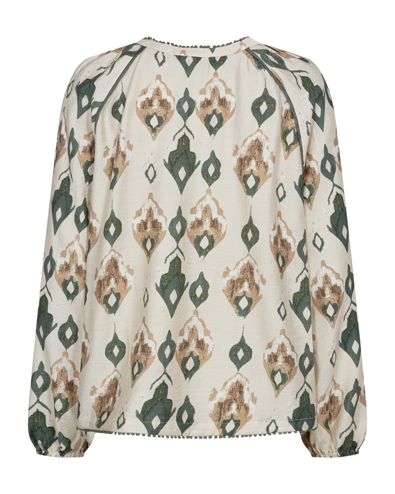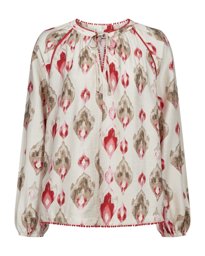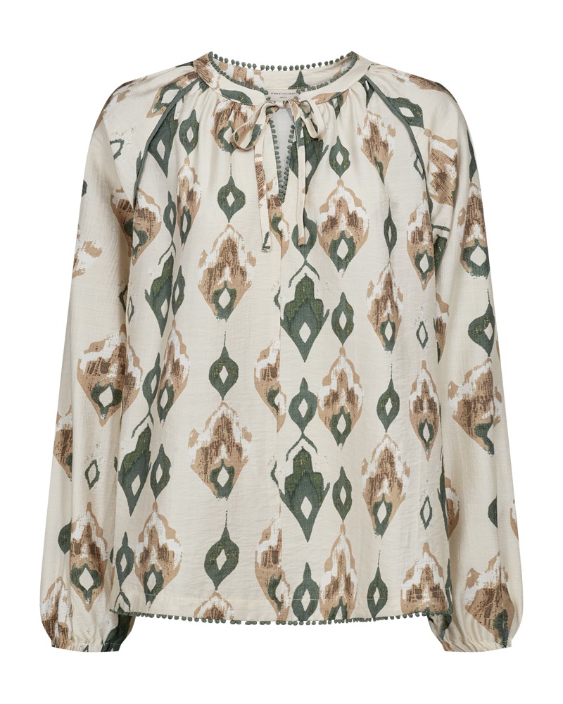 Blouse van Freequent in lichte kwaliteit. De blouse is eenvoudig van stijl met een losse pasvorm, V-hals met stropdasdetail, lange raglanmouwen met elastische afwerking en geborduurde details langs de randen.