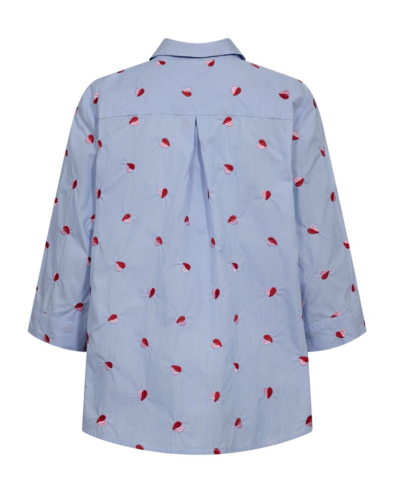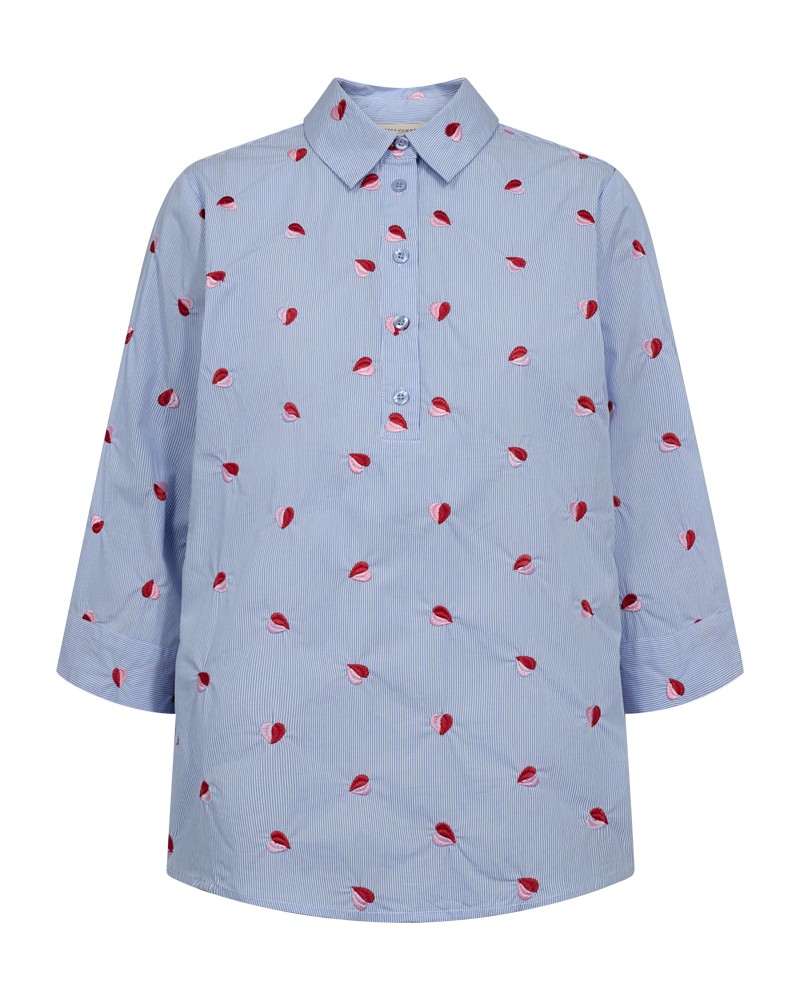 Shirt van Freequent in een zachte stof met strepen. Het shirt is eenvoudig van stijl met driekwart mouwen, kraagplooien, knoopsluiting, plooien aan de achterkant en geborduurde details.