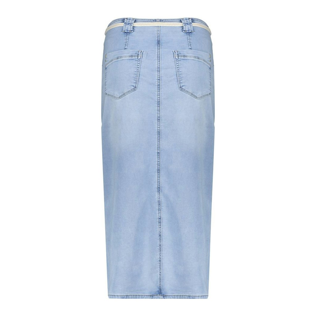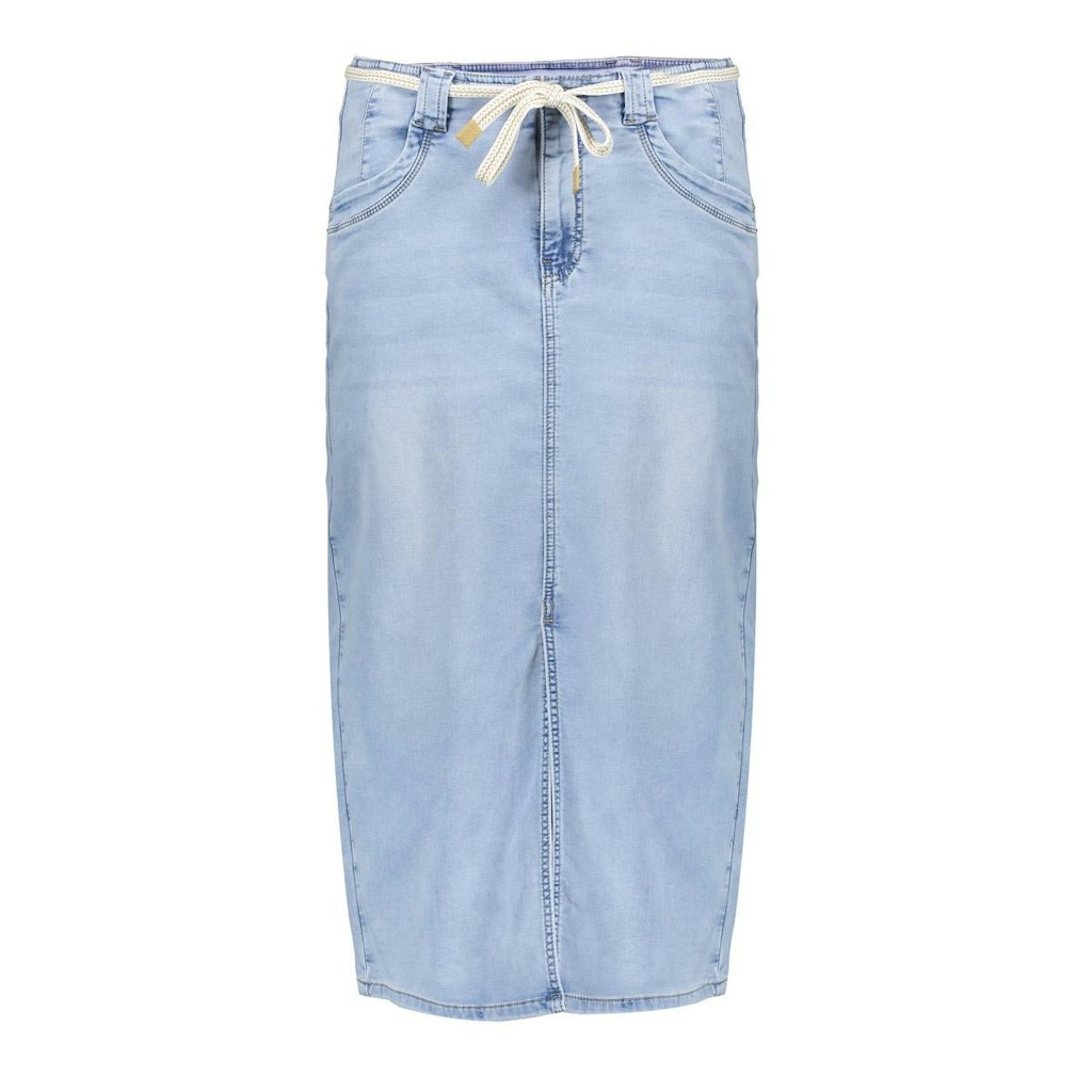 Deze rok is een moderne denim midi-rok met vrouwelijke twist. De hoge taille en aangesloten fit zorgen voor een flatterend silhouet, terwijl de split aan de voorkant een speels accent toevoegt. De veterceintuur benadrukt de taille subtiel.