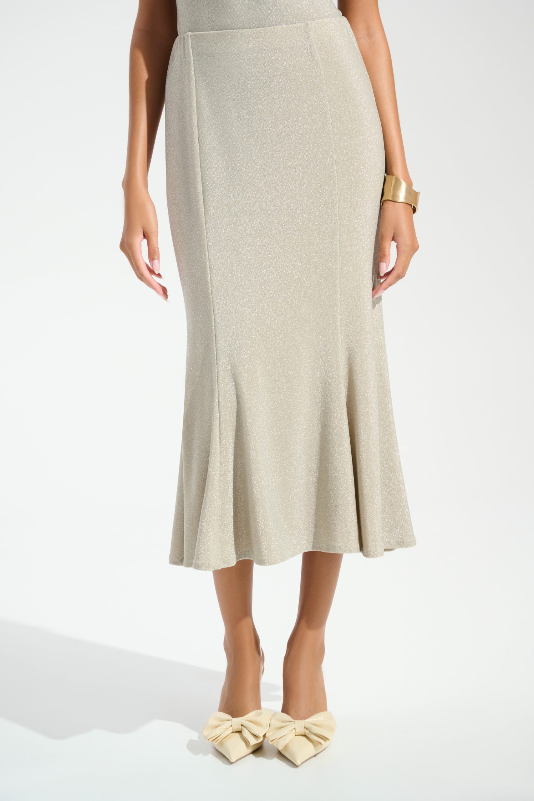 Een trompetrok van glanzend breisel, met prinsessennaden die een flatterend silhouet creëren. Volledig gevoerd voor comfort en een verfijnde afwerking.