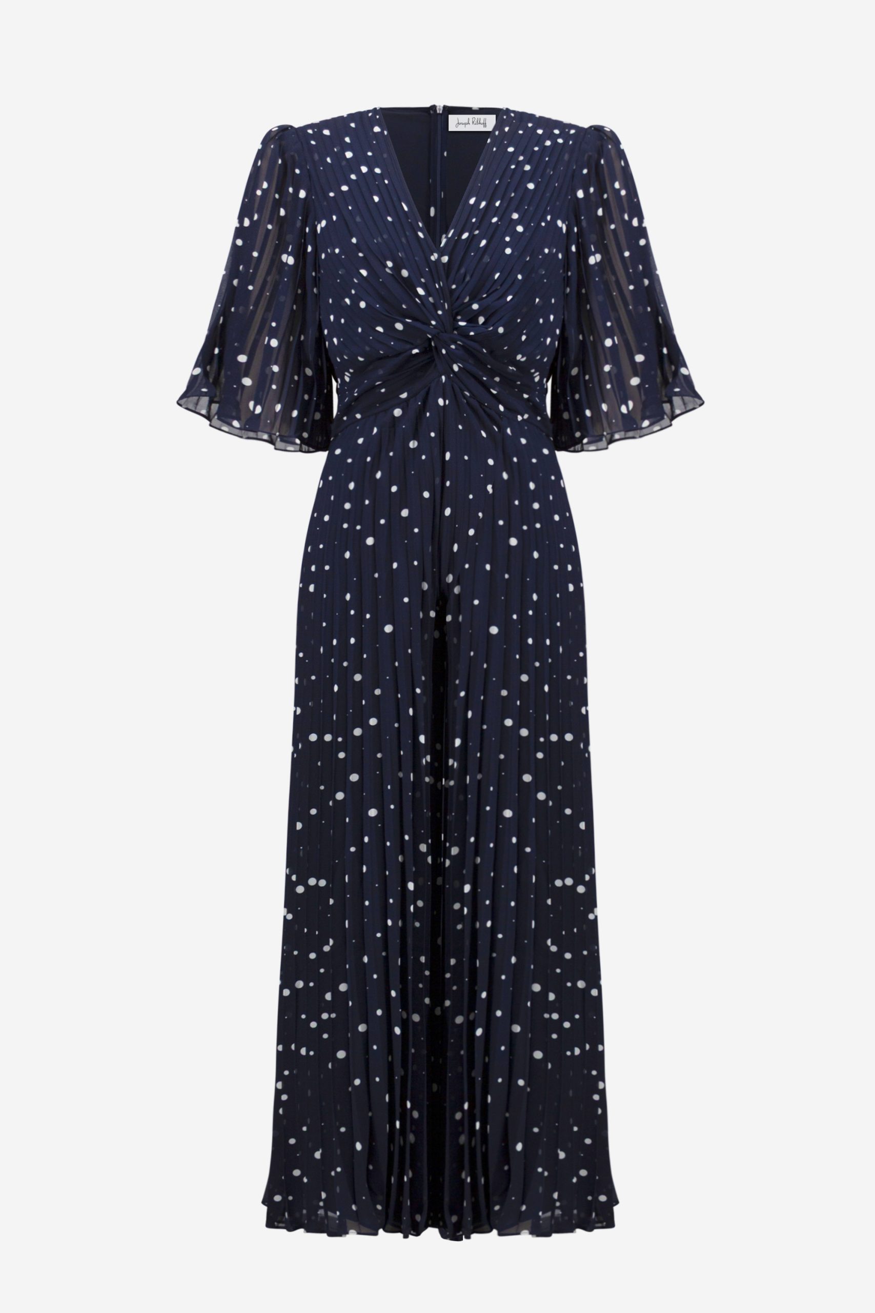Deze chiffon jumpsuit met wijde pijpen, verfraaid met stippenprint en zachte plooien, combineert een romantische zwierigheid met een getailleerde pasvorm. Een geknoopte taille accentueert het silhouet, terwijl uitlopende mouwen en een strakke ritssluiting aan de achterkant voor een verfijnde, comfortabele look zorgen.
