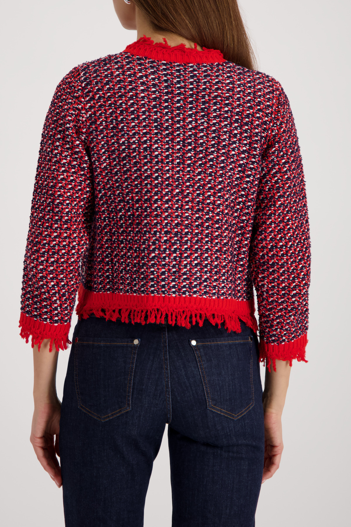 Deze stijlvolle tweed vestje, gemaakt van een hoogwaardige katoenmix, verleidt met zijn zachte textuur, korte model en geribbelde zoom met franjes.