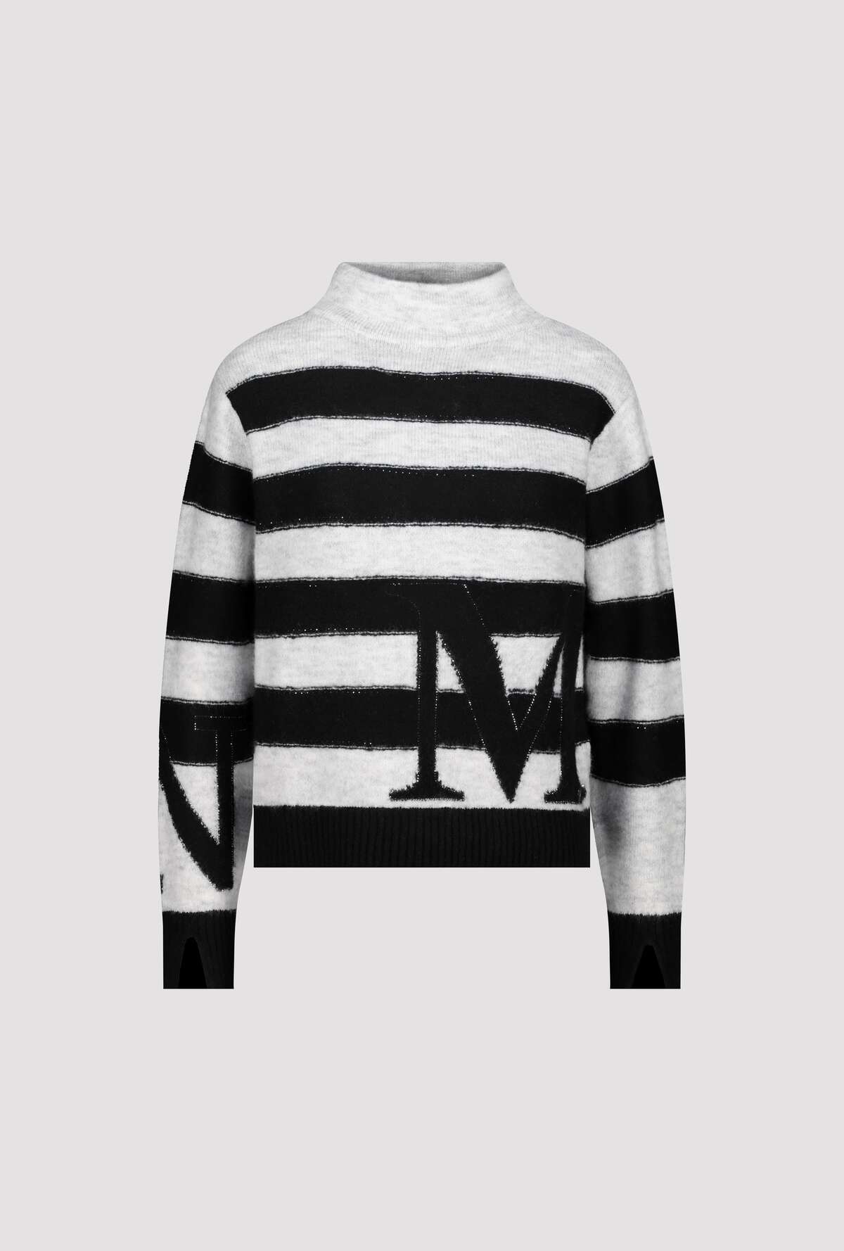 Een elegante trui van soepele viscose met een strepenpatroon, versierd met strass-steentjes, een opstaande kraag en een intarsia-patroon: een must-have!