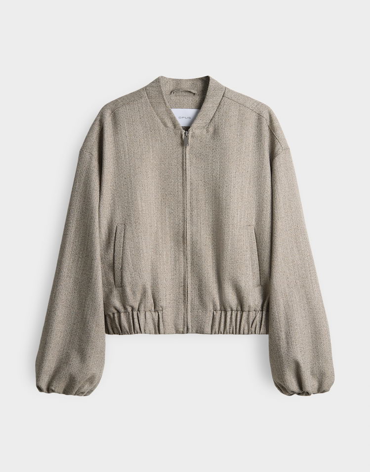 Dit blousonjasje met ballonmouwen en een elastische zoom voegt moeiteloze vrouwelijke nonchalance toe aan elke stadslook. Het fijne visgraatpatroon maakt het een blikvanger voor ontspannen outfits van 's ochtends bij de koffie tot na het werk.