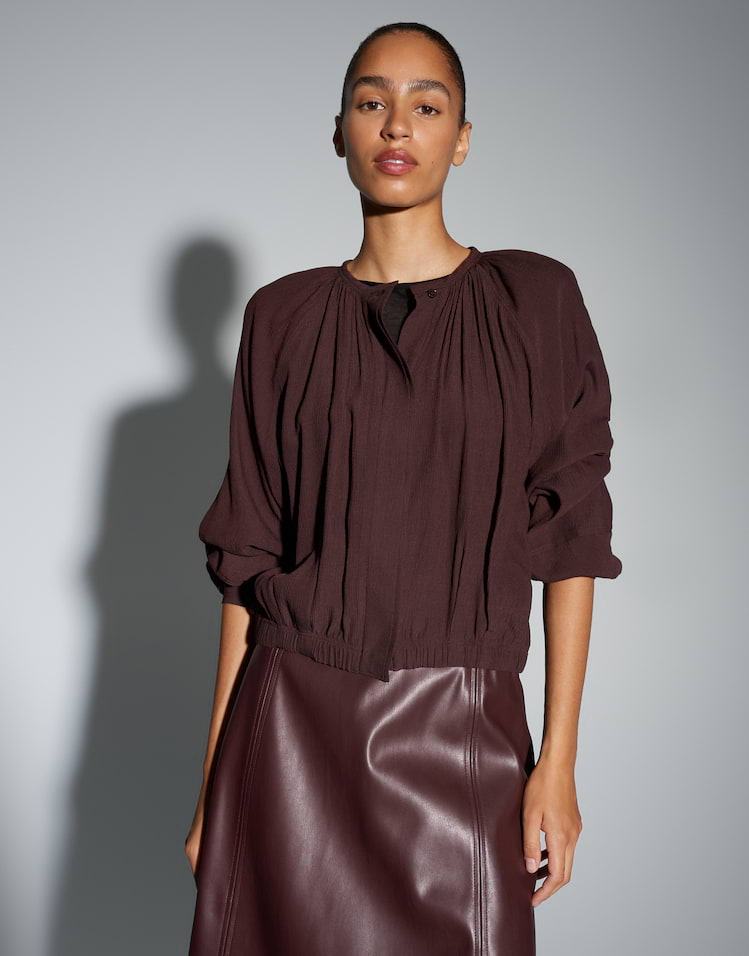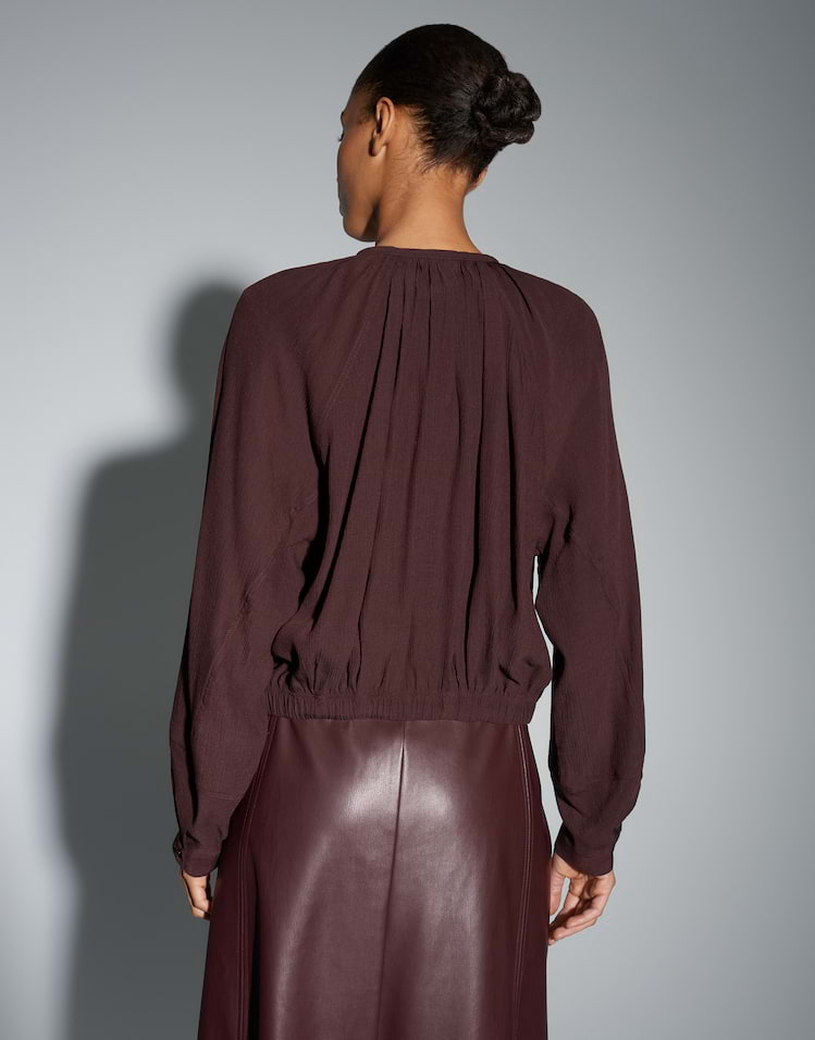 Een vleugje transparantie en de fijne crêpestructuur geven deze blouse in tuniekmodel een feestelijke uitstraling. Het vrouwelijke strikdetail aan de zoom creëert een licht O-vormig silhouet, perfect voor onvergetelijke momenten.