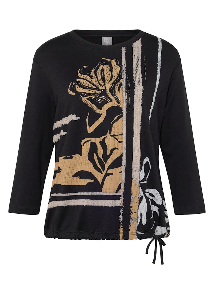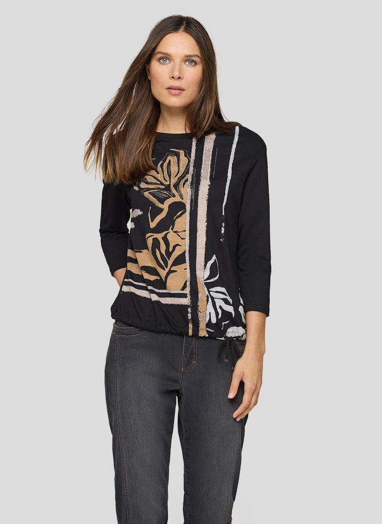 Dit comfortabele jersey shirt overtuigt met een expressieve print in een bloemenprint aan de voorkant. De elastische katoenmix met 5% elastaan zorgt voor een hoog draagcomfort en een prettige pasvorm. De zoom is voorzien van een trekkoord en een dasband die het shirt nonchalant afmaakt. De achterkant is monochroom en maakt de uitstraling compleet.