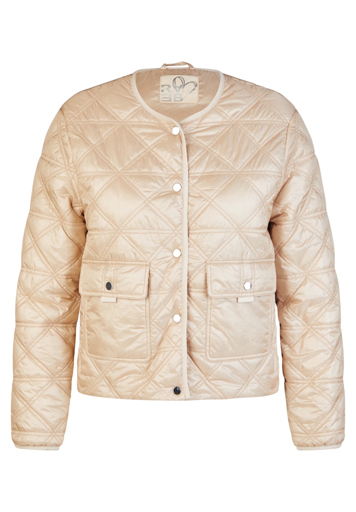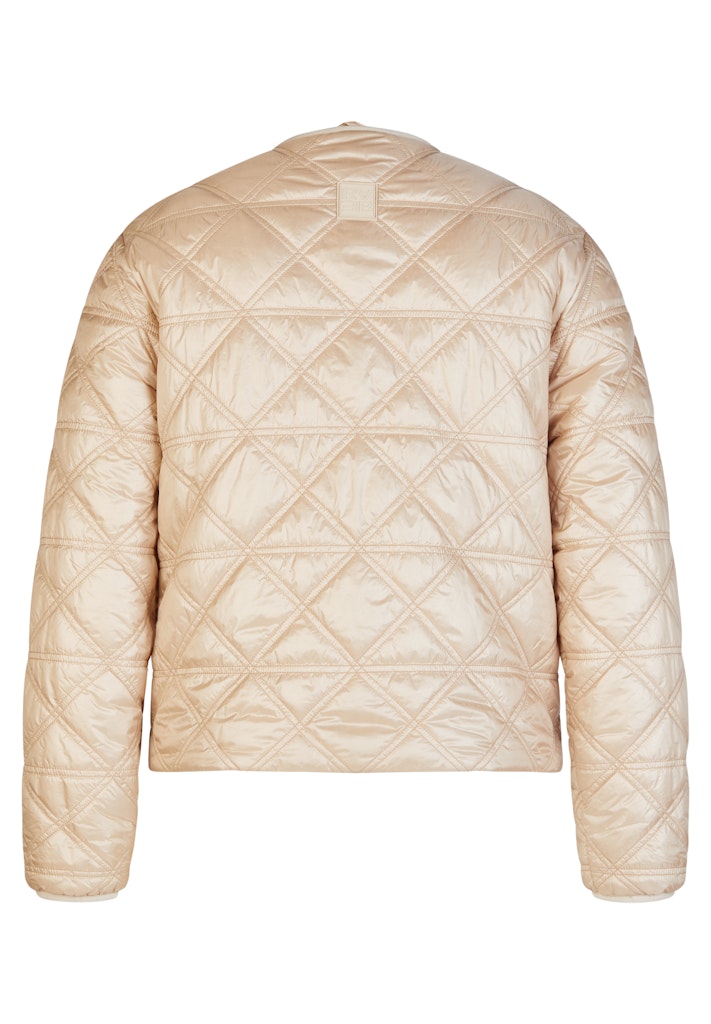 Deze gewatteerde jas scoort met een sportieve uitstraling en praktische details. De grote kleppen met pressenknopen bieden opbergruimte, terwijl het ontbreken van een kraag een moderne twist aan het uiterlijk geeft. De subtiele glans maakt het ontwerp stijlvol compleet.