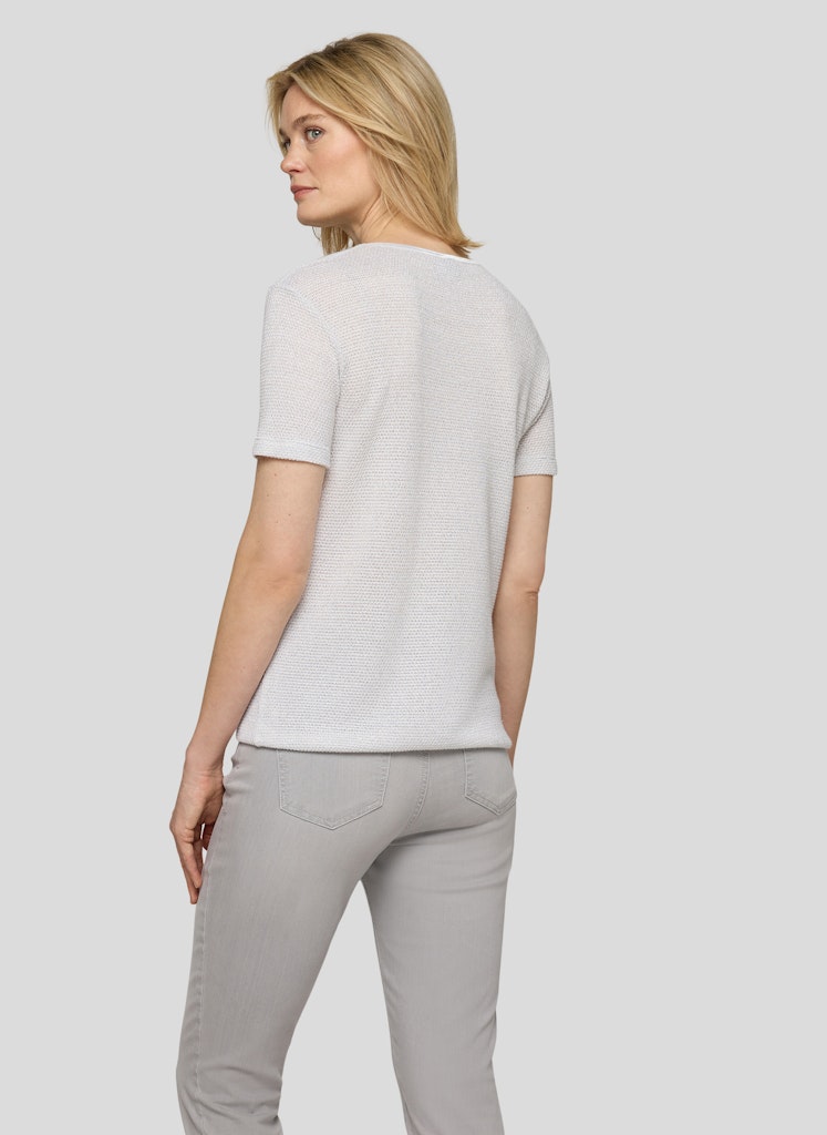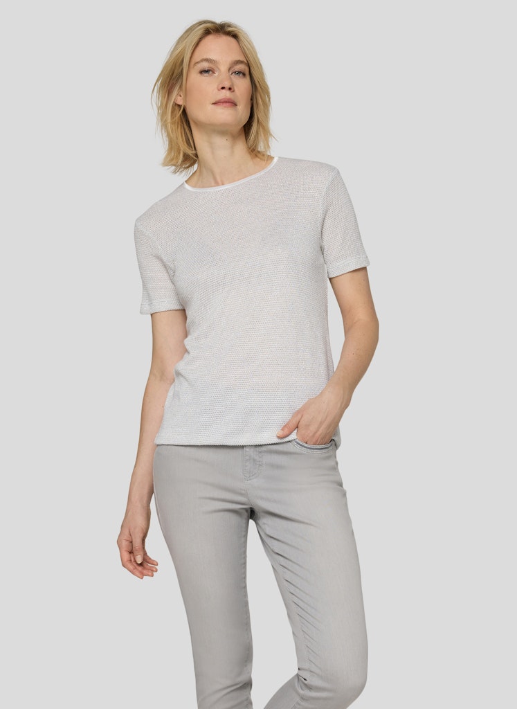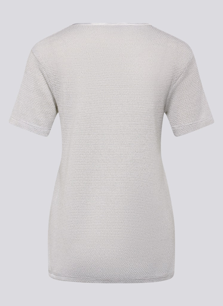 Dit fijngebreide shirt overtuigt met een speciale materiaalsamenstelling van 87% viscose en 13% maguey. De viscose geeft een zacht, vloeiend gevoel, terwijl de maguey-inhoud de stof structuur en subtiele stabiliteit geeft. Het oppervlak is licht glanzend en onderstreept de hoogwaardige uitstraling. De klassieke ronde halslijn en het eenvoudige silhouet maken het model veelzijdig om te combineren.