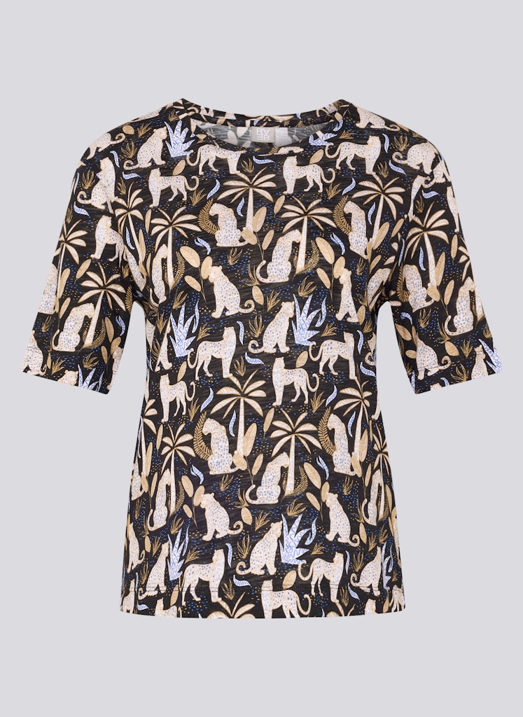 Dit shirt overtuigt met een aangename materiaalmix van katoen en viscose, die zacht aanvoelt op de huid en tegelijkertijd zorgt voor een vloeiende, lichte kwaliteit. De klassieke ronde halslijn en halve mouwen onderstrepen het eenvoudige karakter. Het expressieve allround ontwerp met exotische motieven geeft het model een bijzondere touch en maakt het een blikvanger in moderne vrijetijdsoutfits.