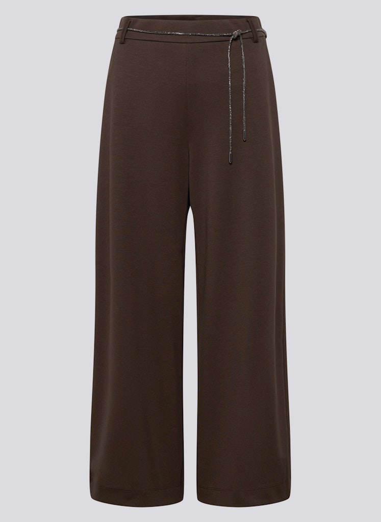 Deze slip-on broek combineert comfort en moderne casualness in een strakke silhouet. De elastische tailleband met de strikband zorgt voor een flexibele pasvorm, terwijl het brede, rechte been losjes valt en bewegingsvrijheid biedt. Zijvakken vullen het praktische ontwerp aan. Het materiaal dat zich mengt met viscose, polyester en elastaan voelt zacht aan, behoudt zijn vorm en is aangenaam elastisch – ideaal voor ontspannen alledaagse looks of verzorgde casual outfits.