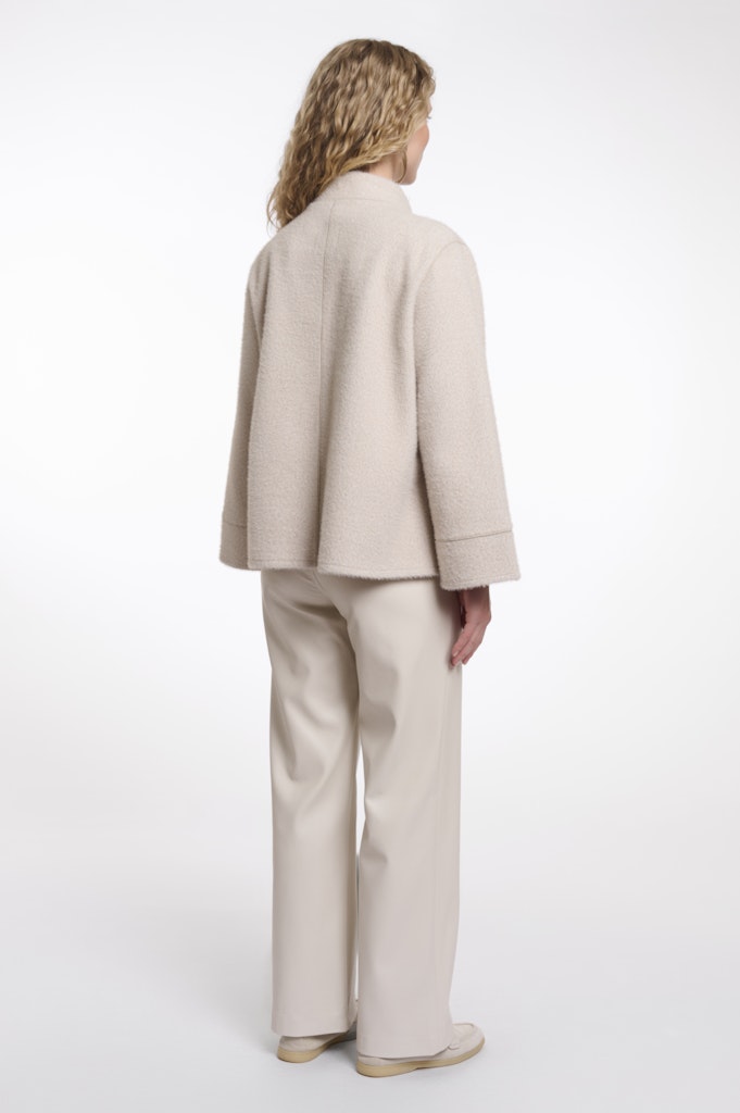 Hul jezelf in verfijnde elegantie met deze zachte, zwaardere jas, ontworpen in een los silhouet met licht uitlopende mouwen en een subtiele opstaande kraag. De voorkant is voorzien van vijf knopen en netjes gestikte opgestikte zakken, die structuur toevoegen met behoud van het vloeiende, cape-achtige gevoel. Door de langere lengte en soepele drapering is het een moeiteloze laag voor zowel een gepolijste als een ontspannen stijl.