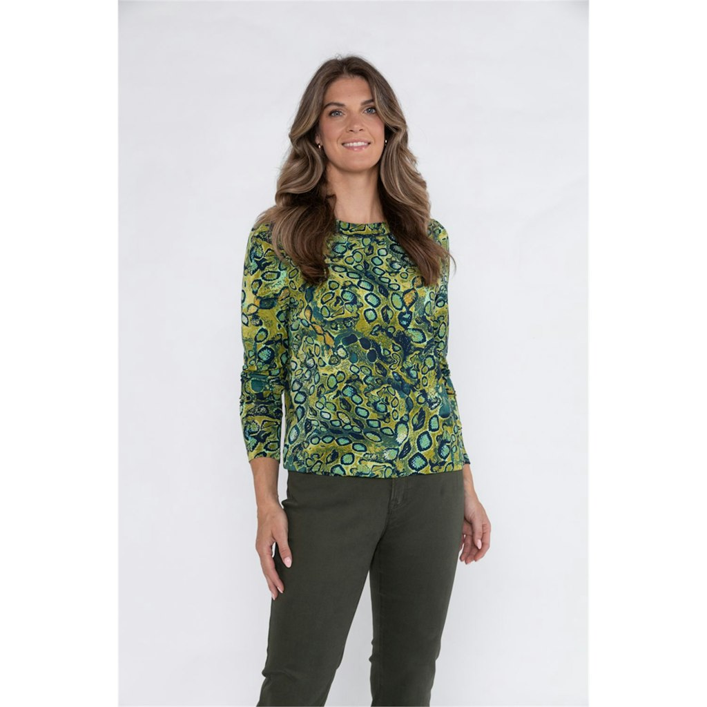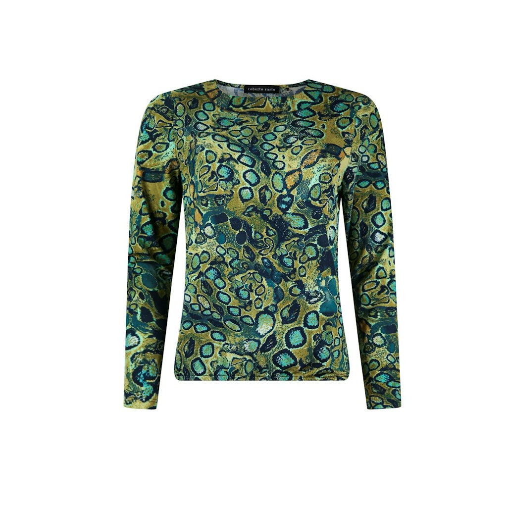 T-shirt met ronde hals. Dit blouson model heeft lange mouwen en sluit mooi aan op de heup door een elastische zoom.