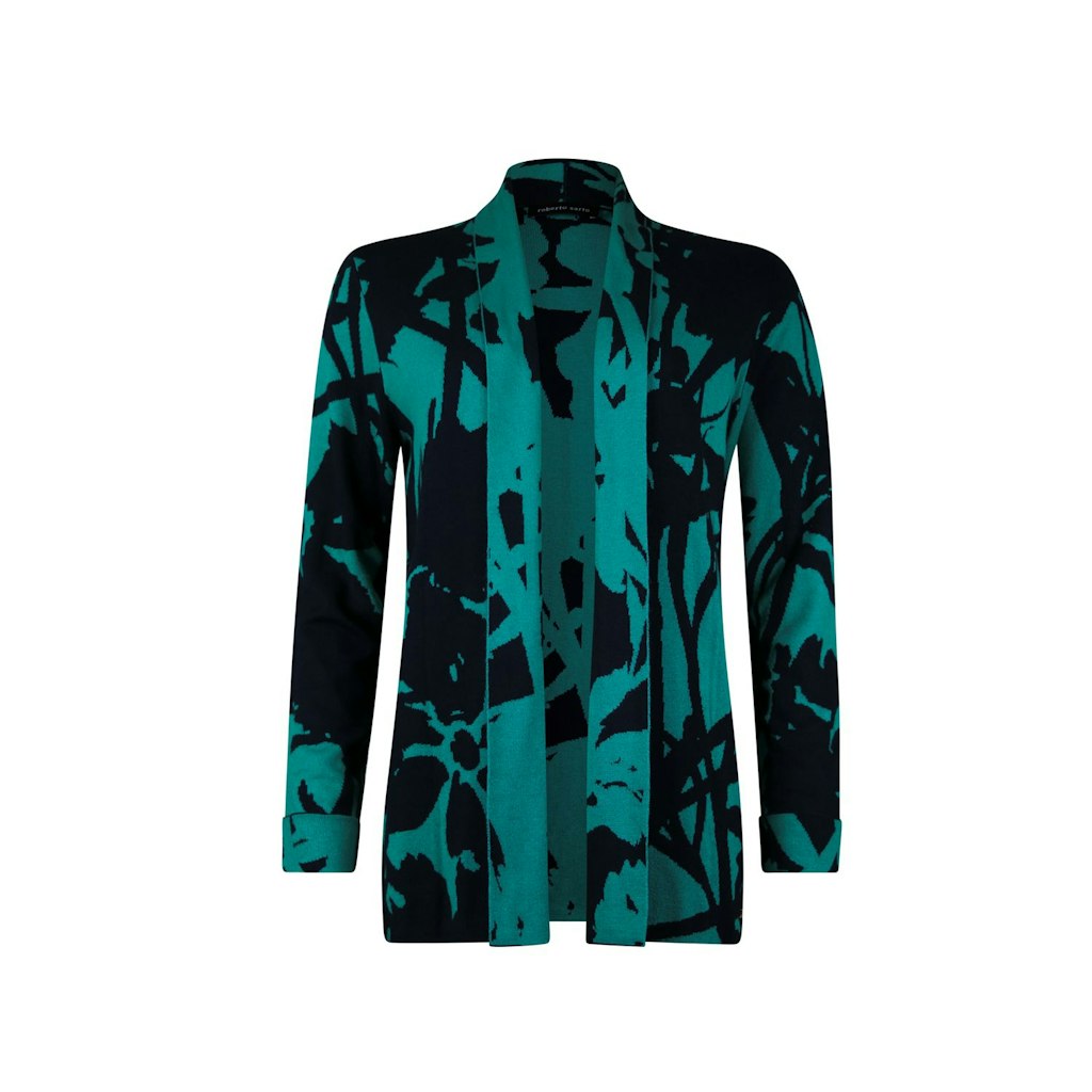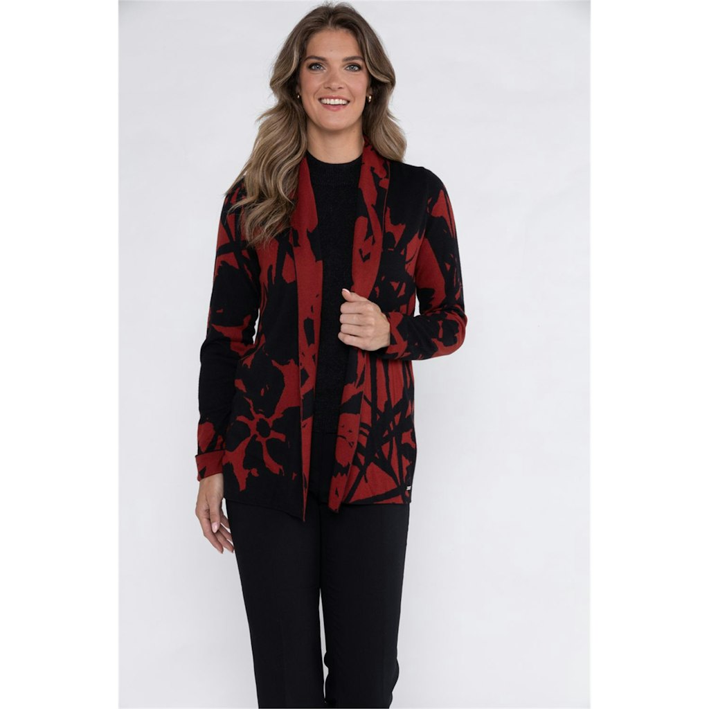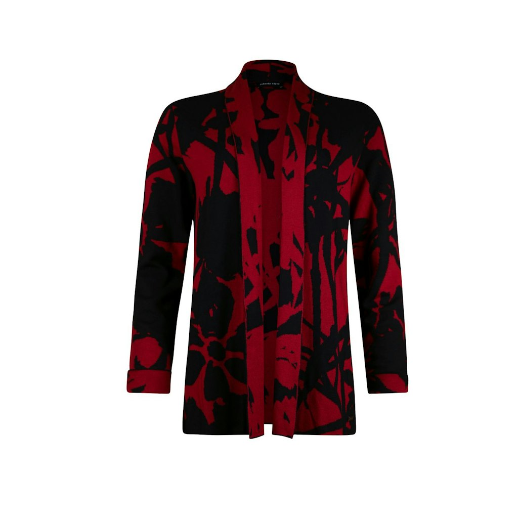 Shawlkraag vest in zacht tweekleurig jacquard breisel met opstaande kraag. Vest is in een langer model waardoor het makkelijk te combineren.