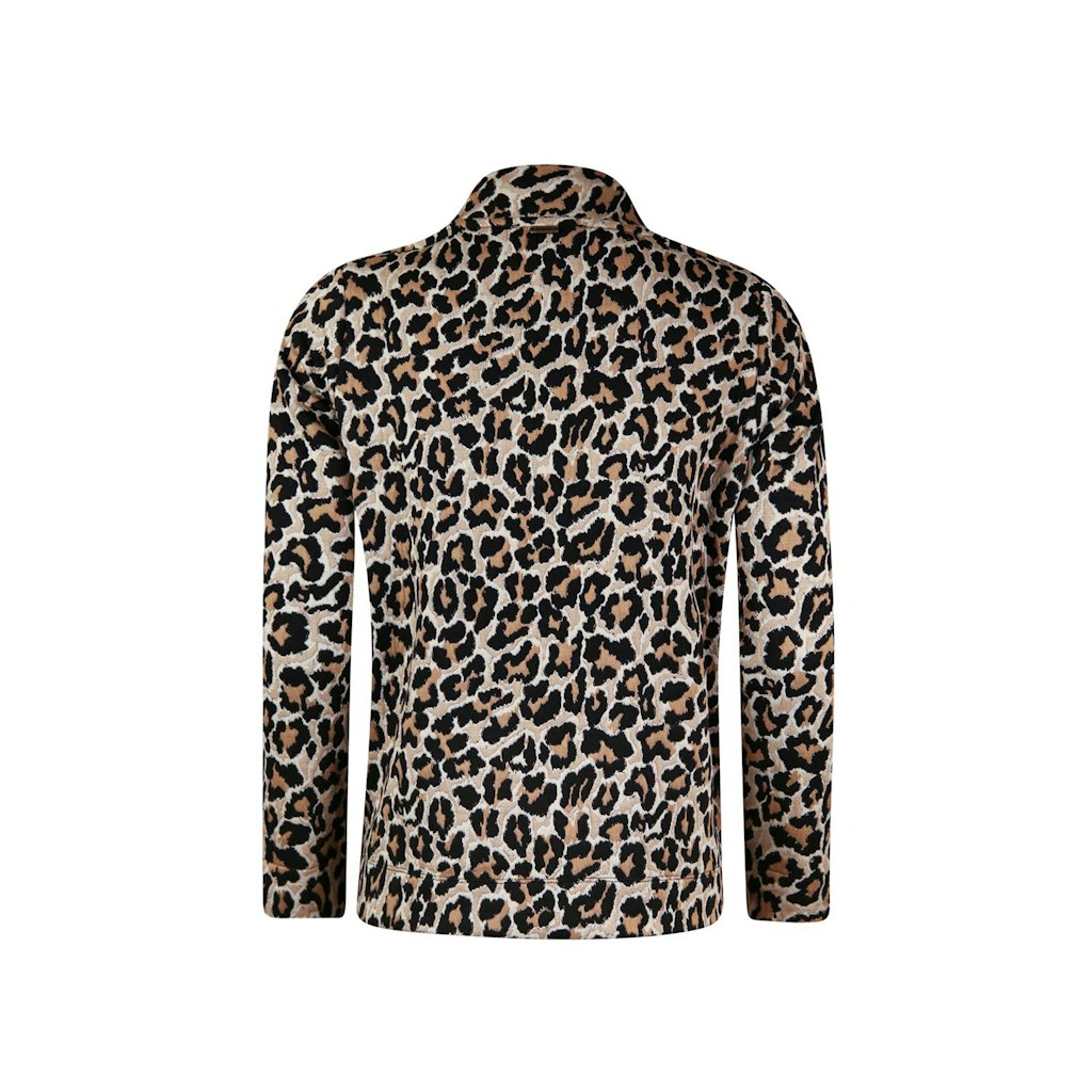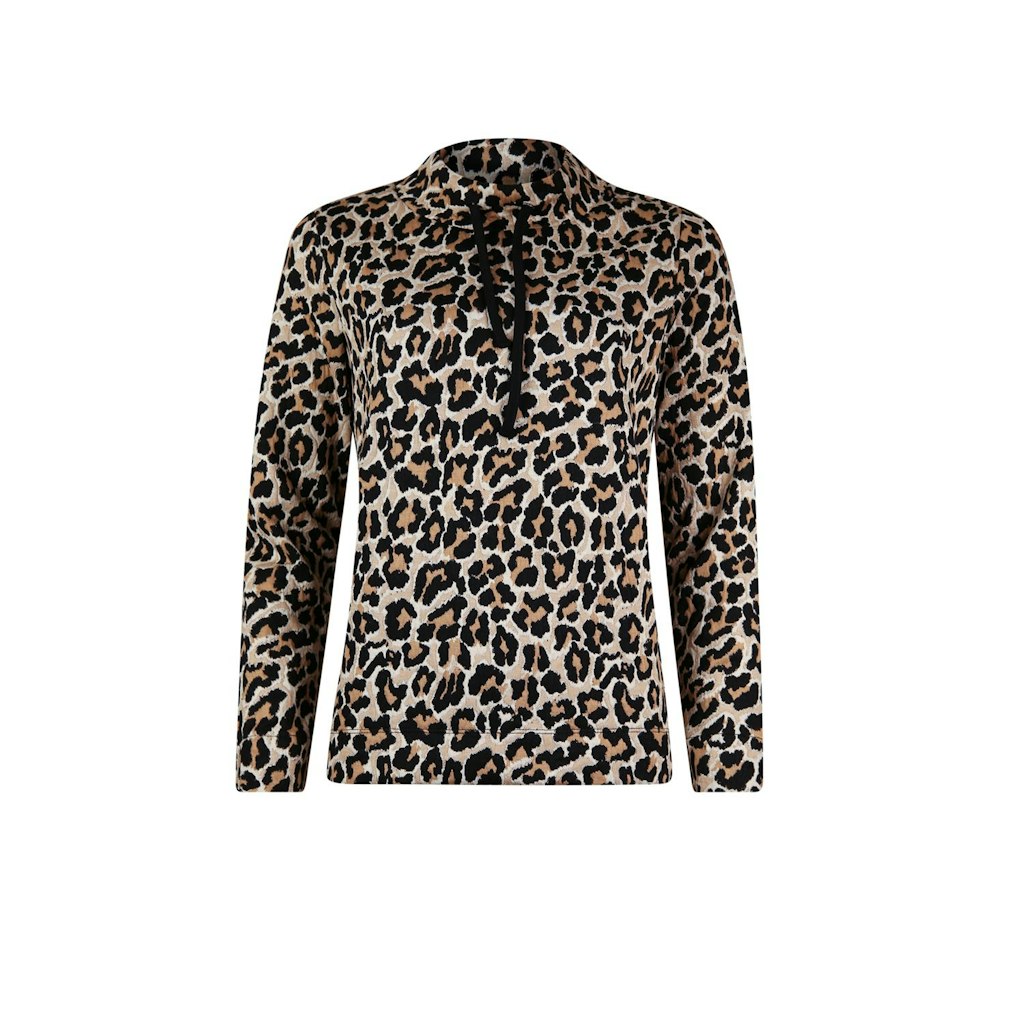 Sportieve pullover met opstaande kraag en koord in meerkleurige structuur jacquard jersey. Aan weerzijde een uni smalle bies met split gesloten door druk knopen.