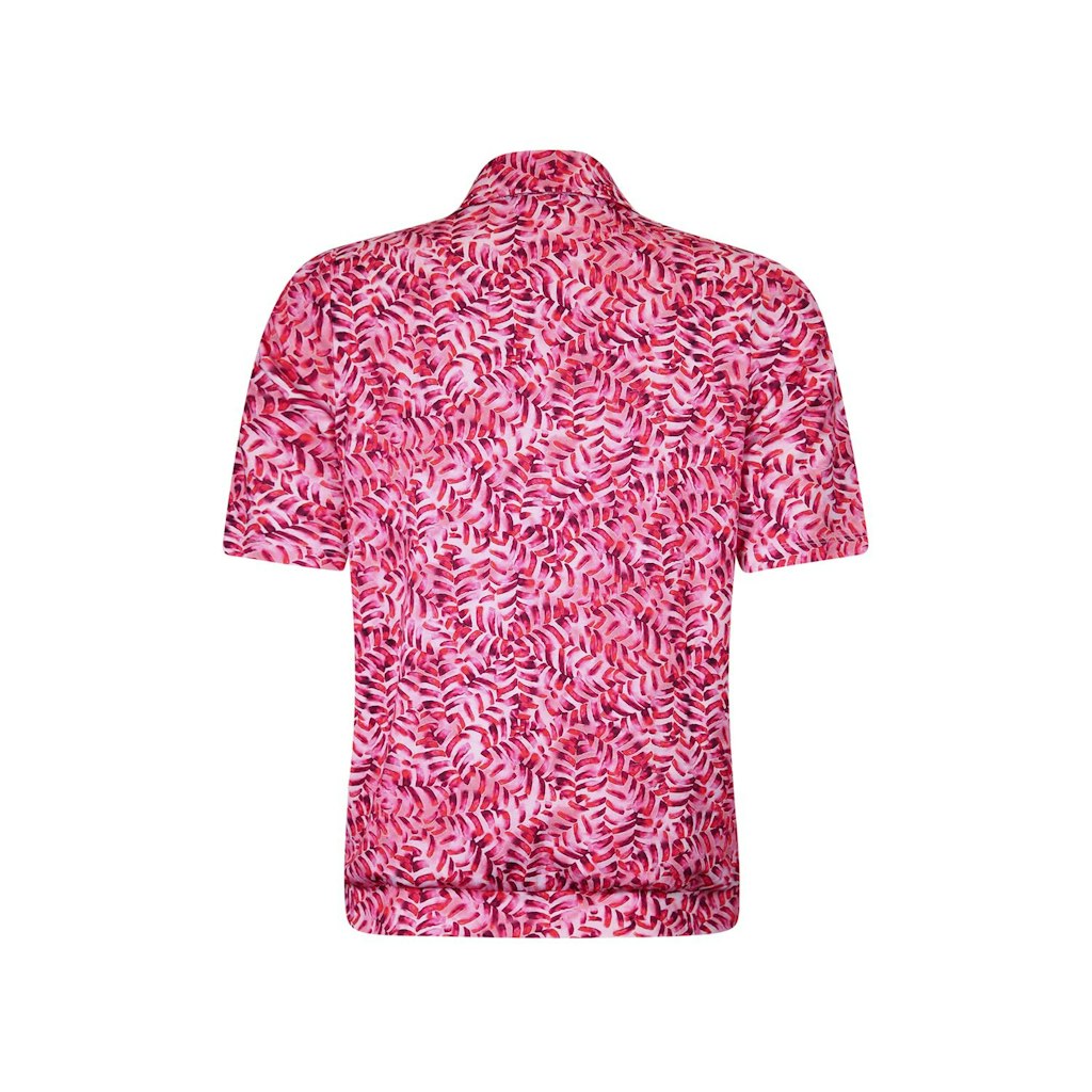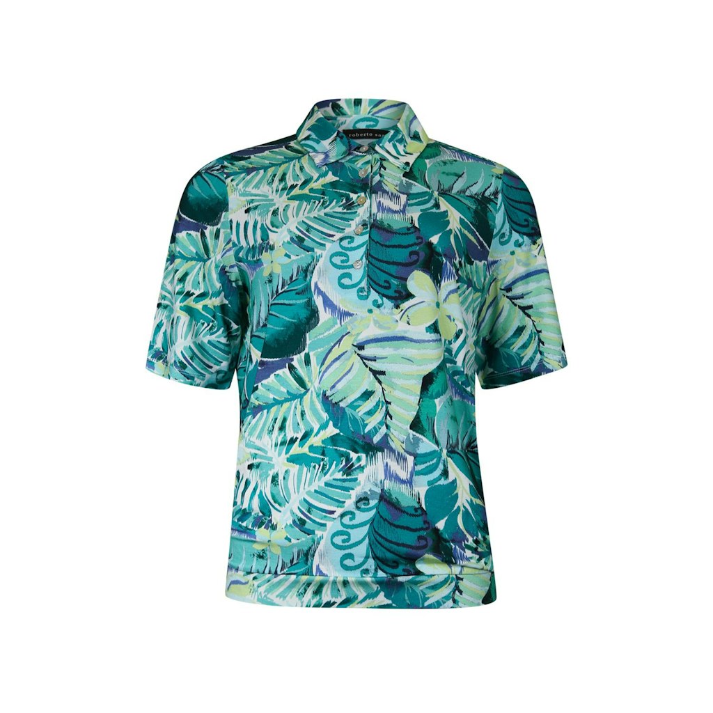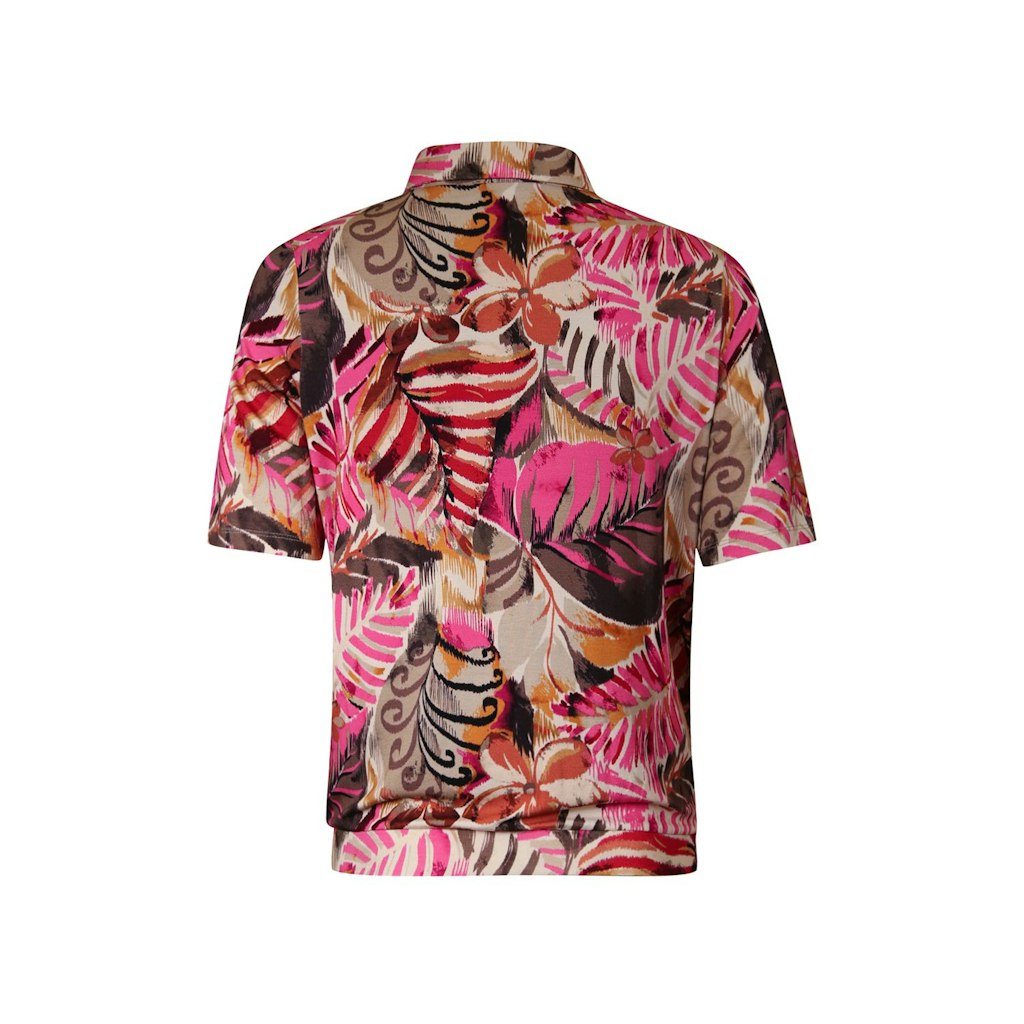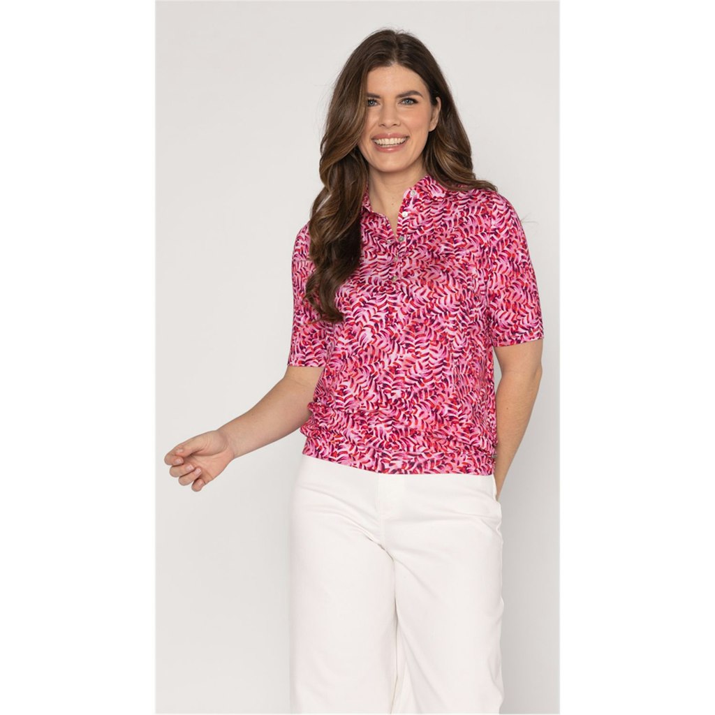 T-shirt met polo kraag met knoopsluiting en driekwart mouw in een viscose-elastaan. Blouson model door een bredere onderboord die mooi aansluit op de heup.
