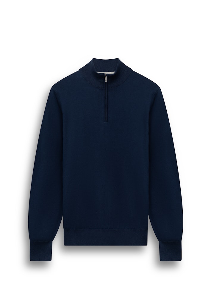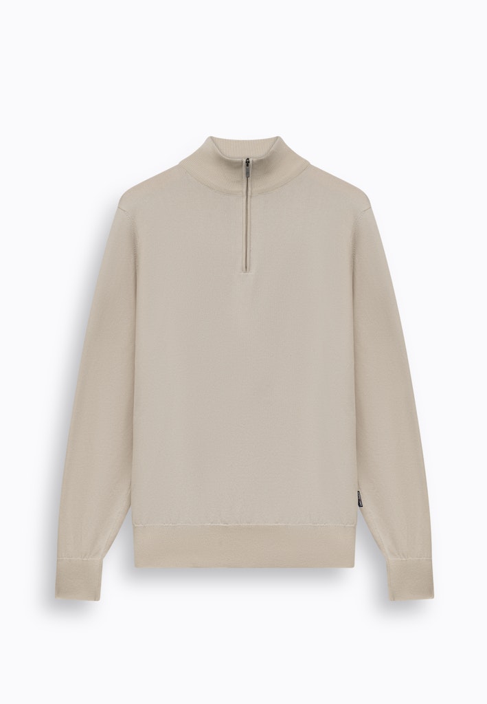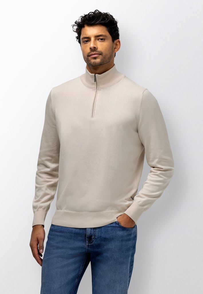 Deze effen fijngebreide trui met halve rits heeft een moderne, verzorgde uitstraling en een comfortabele regular fit. De zachte mix van katoen, modal en polyamide zorgt voor een licht en soepel draaggevoel met een prettige structuur, terwijl de opstaande kraag met rits een sportief accent geeft en veelzijdig combineert.