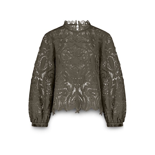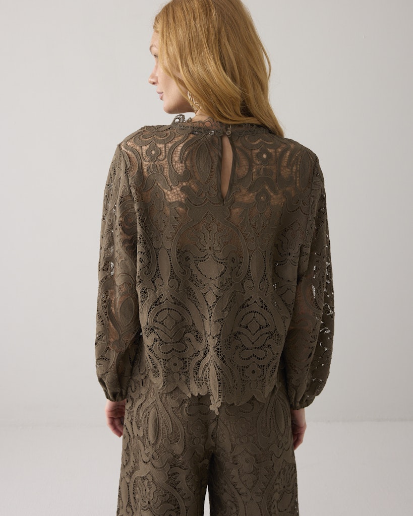 Deze boxy kanten top heeft lange pofmouwen met elastiek en een satijnen afwerking bij de boorden. Het borduurwerk en de kanten afwerking rond de hals en zoom geven de blouse een feminine look. De achterkant heeft een splitje met een knoopsluiting.