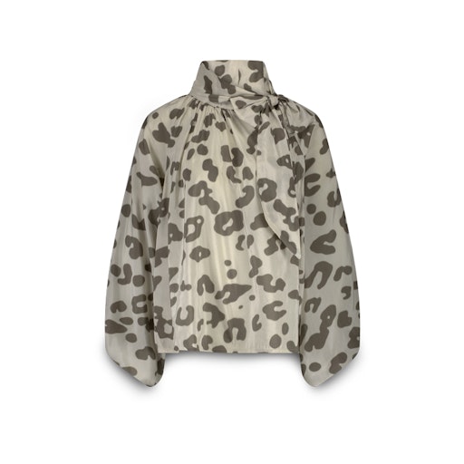 Deze vrouwelijke top van zachte viscose heeft een speelse bowtie en wijde ballonmouwen met gedeeltelijk gesmokte manchetten. De top valt wijd.