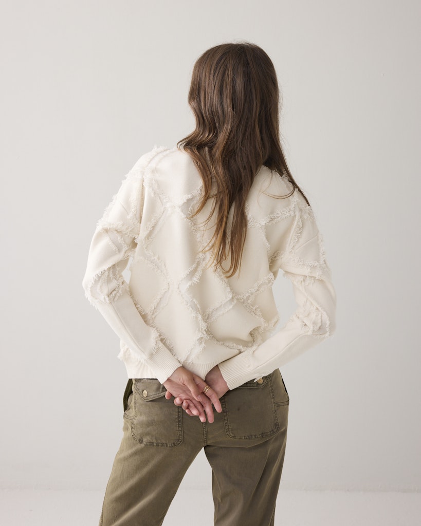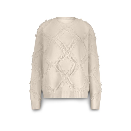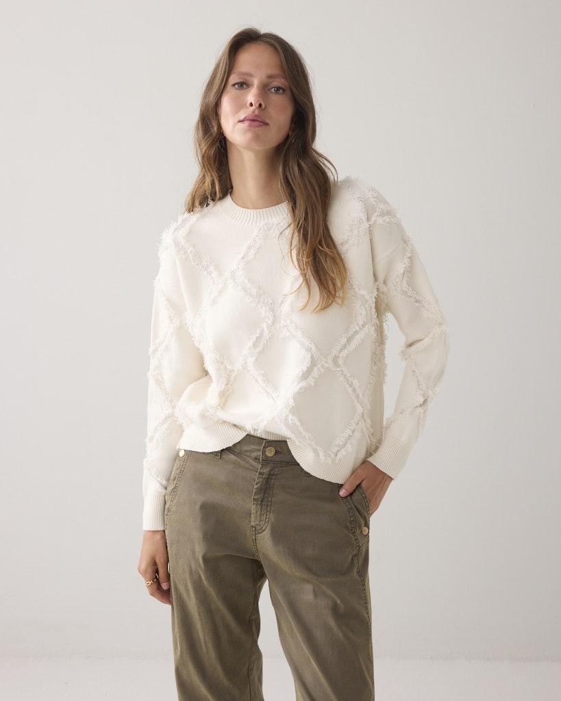Trui met een regular fit en verlaagde mouwinzet, gebreid van een heerlijk zacht viscose blend garen. Het ruitpatroon is met de hand ingebreid en rondom afgewerkt met franjes.
