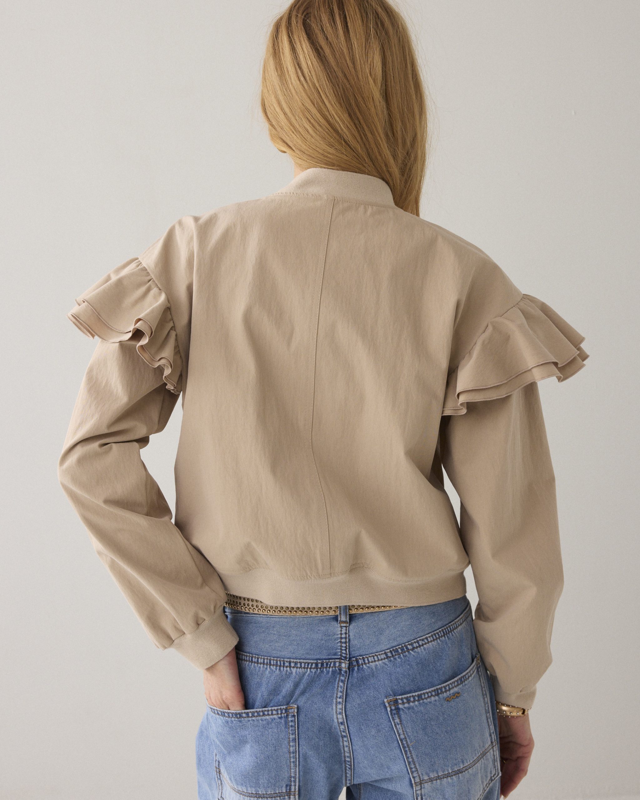 Bomberjack van katoenblend met lichte stretch en contrastvoering. Het jasje heeft een metalen rits, verlaagde schouders en ruches op de mouwinzet, afgewerkt met babylock.