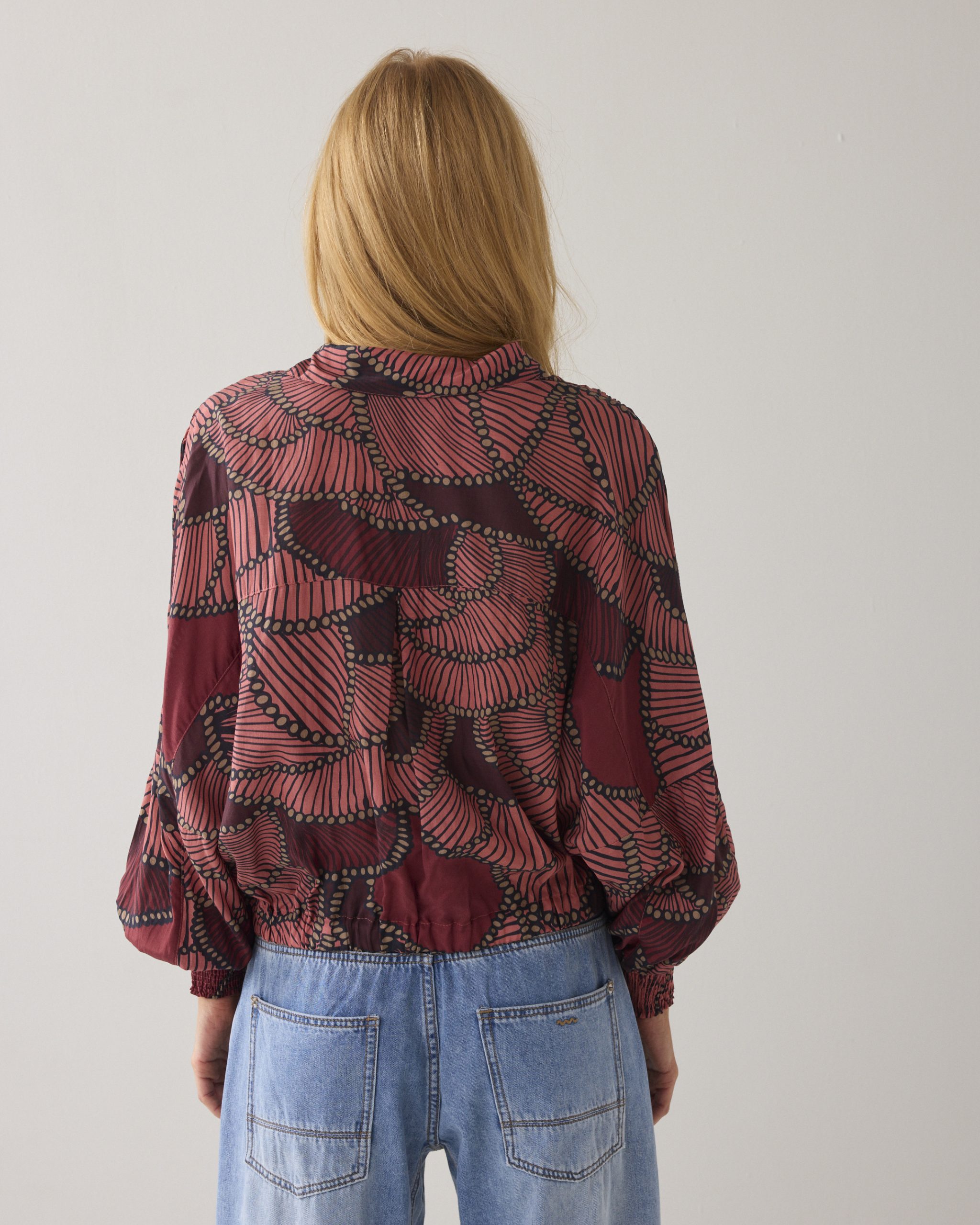 Blouse van een lichte viscose-katoenkwaliteit in een opvallende print. De blouse heeft een vleermuismouw met gesmokte manchetten en een achterpas met extra rimpels voor volume. De onderkant is verstelbaar met een koordje.