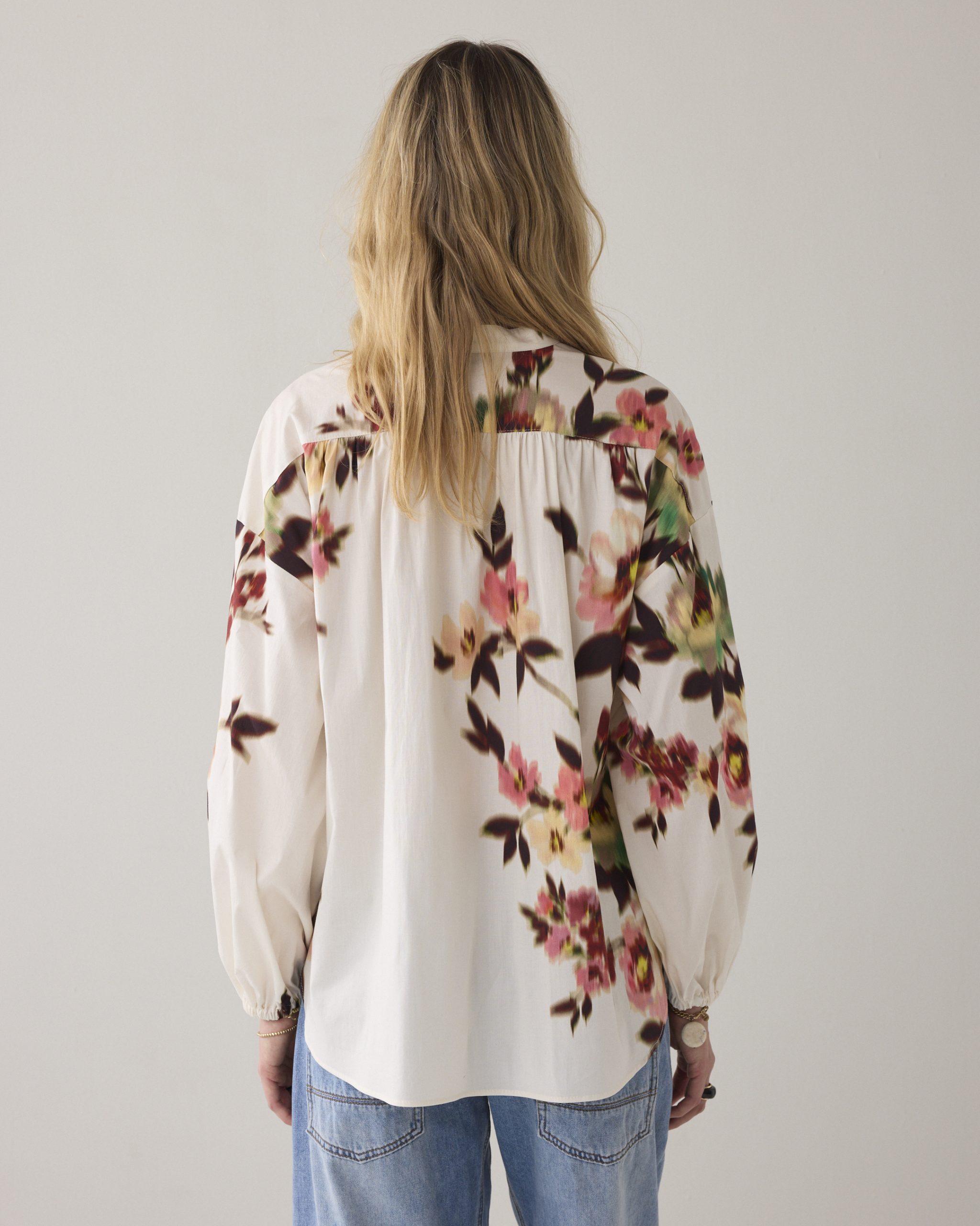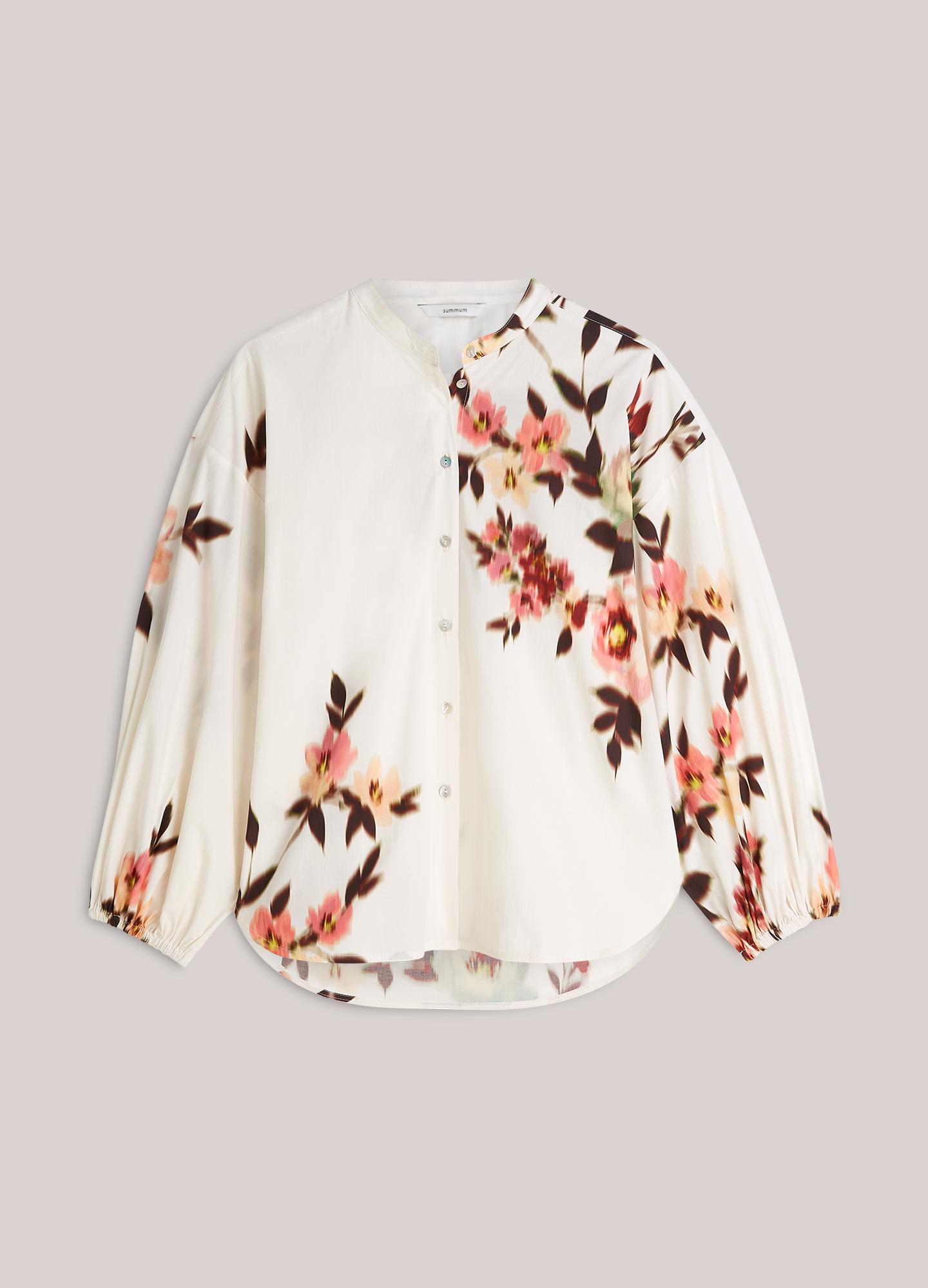 Blouse van 100% katoen met een willekeurig geplaatste faded bloemenprint. De blouse heeft lange mouwen met elastische boordjes en een knoopsluiting met parelmoerkleurige knoopjes.