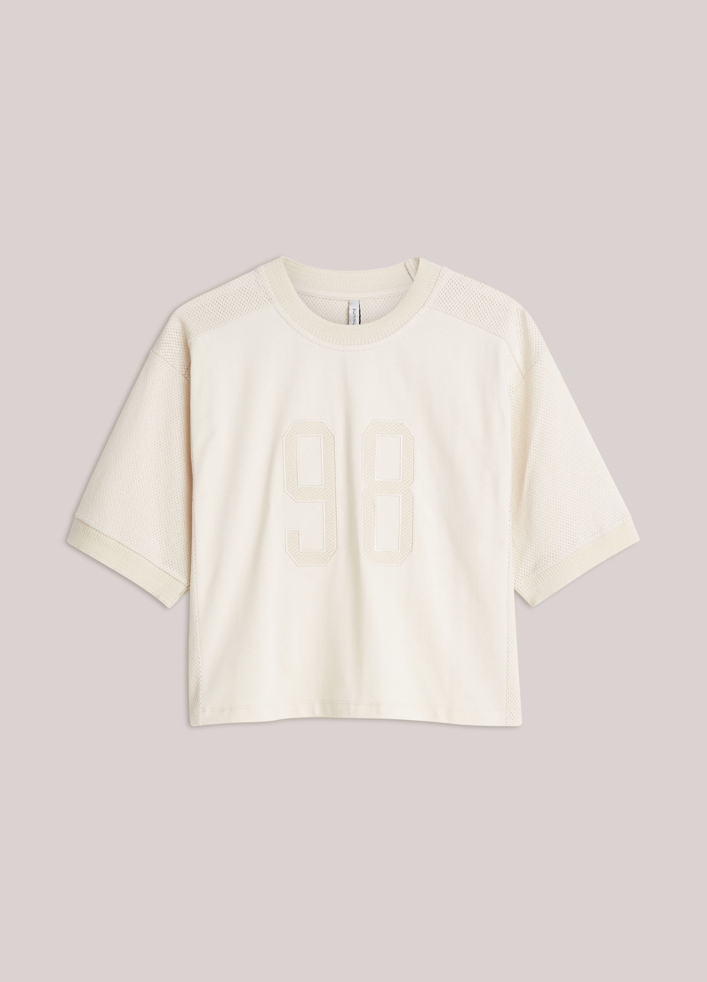 Baseballshirt met katoenen jersey body en mesh inzet aan mouwen, zijpanden en schouderpas. Het model heeft een boxy fit, gebreide boordjes en een ton-sur-ton mesh applicatie met het cijfer 98: een verwijzing naar Summums oprichtingsjaar.