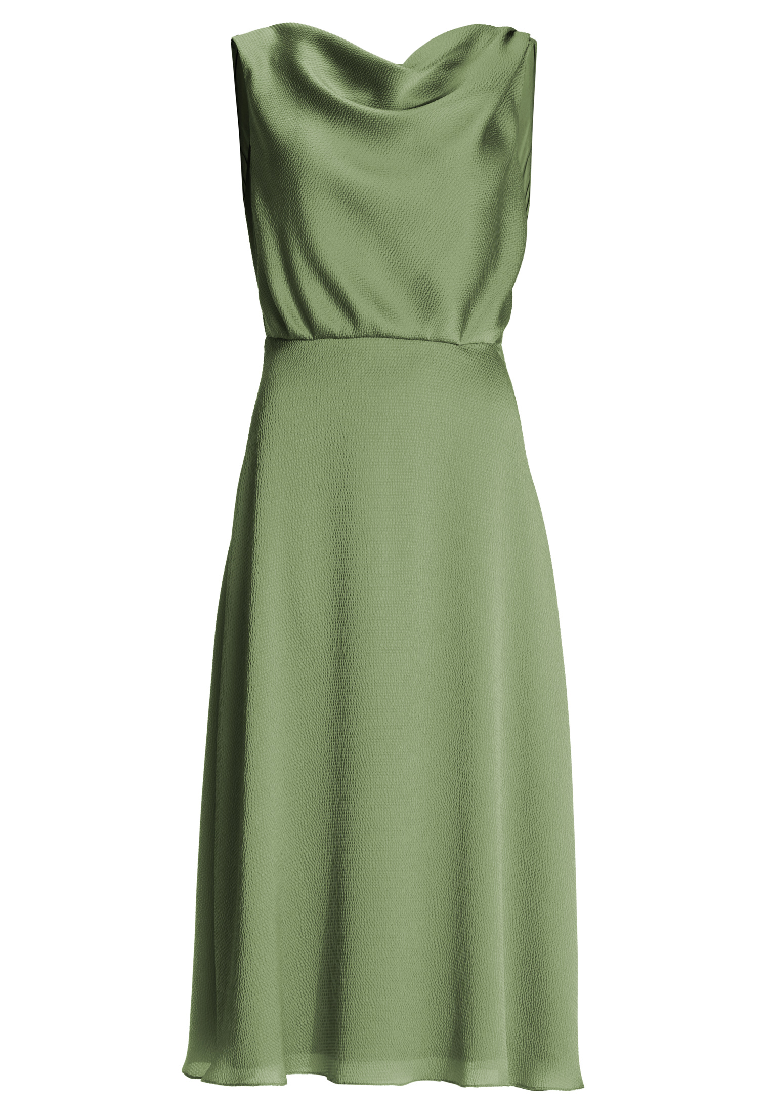 Eenvoudige midi-jurk met een watervalhals - ideaal voor burgerlijke huwelijken, elegante dagfeesten of zomerse diners. De vloeiende stof en de zacht geaccentueerde taille geven de look een subtiele, vrouwelijke touch. Met een glinsterende afwerking en een strak ontwerp kan het op veel manieren gecombineerd worden.