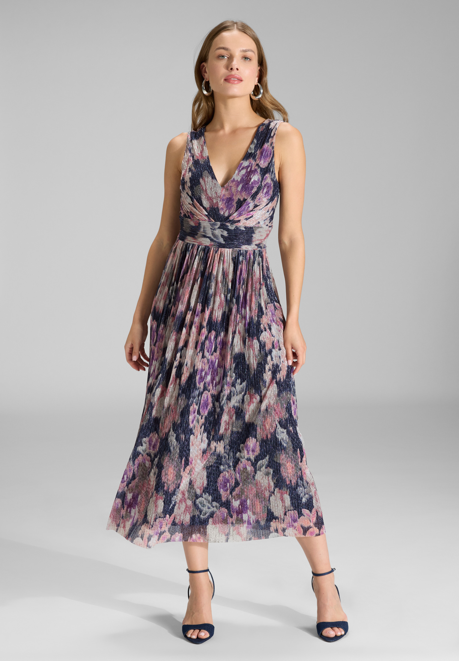 Vrouwelijk en lichtgewicht, deze midi-jurk met een delicate geplooide rok en bloemenprint is perfect voor zomerse bruiloften, verjaardagsfeestjes of feestelijke diners. De brede tailleband zorgt voor een prachtige silhouet, terwijl de V-hals D. De glinsterende stof voegt een vleugje glamour toe aan de look. Een romantische blikvanger voor onvergetelijke momenten.