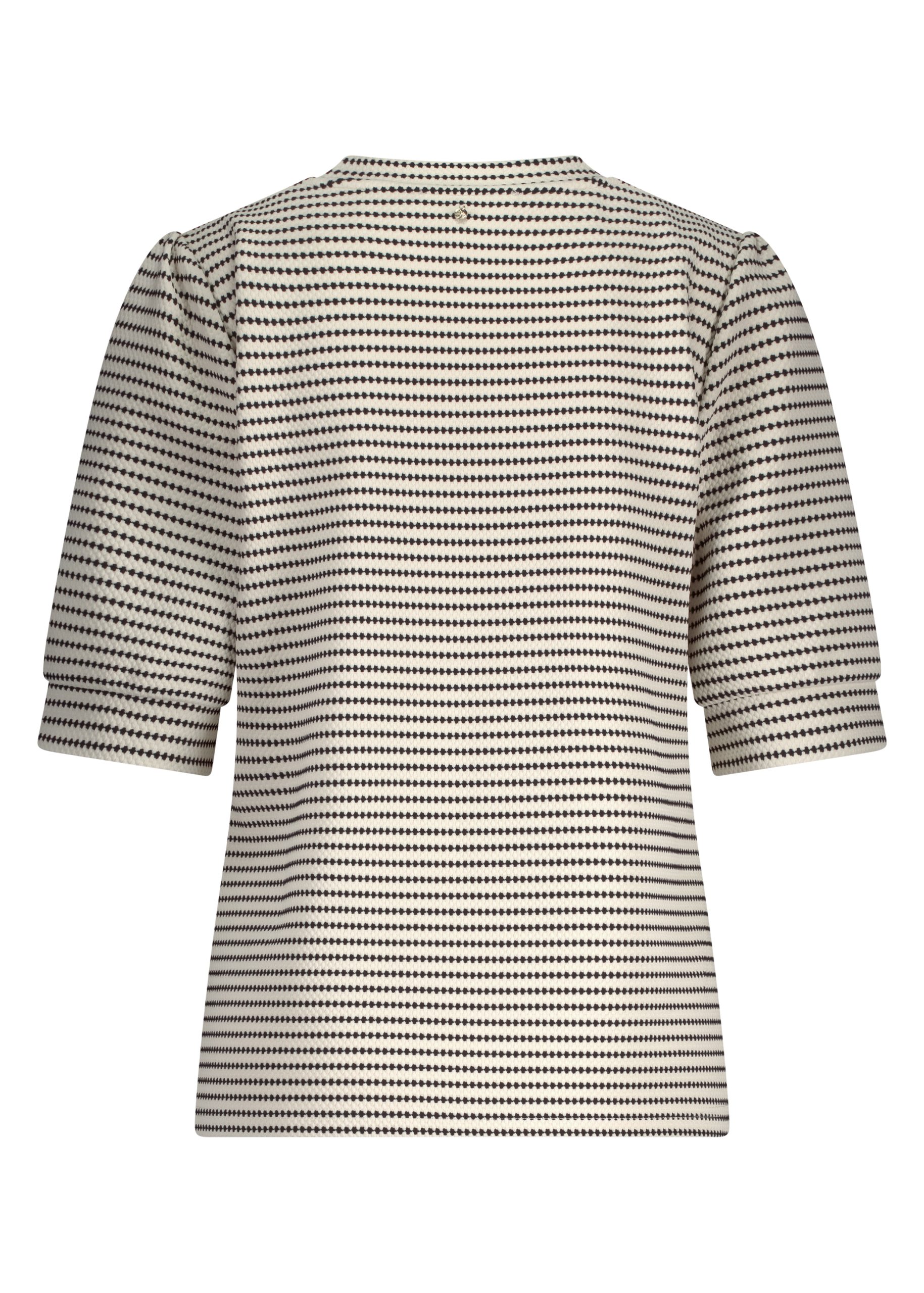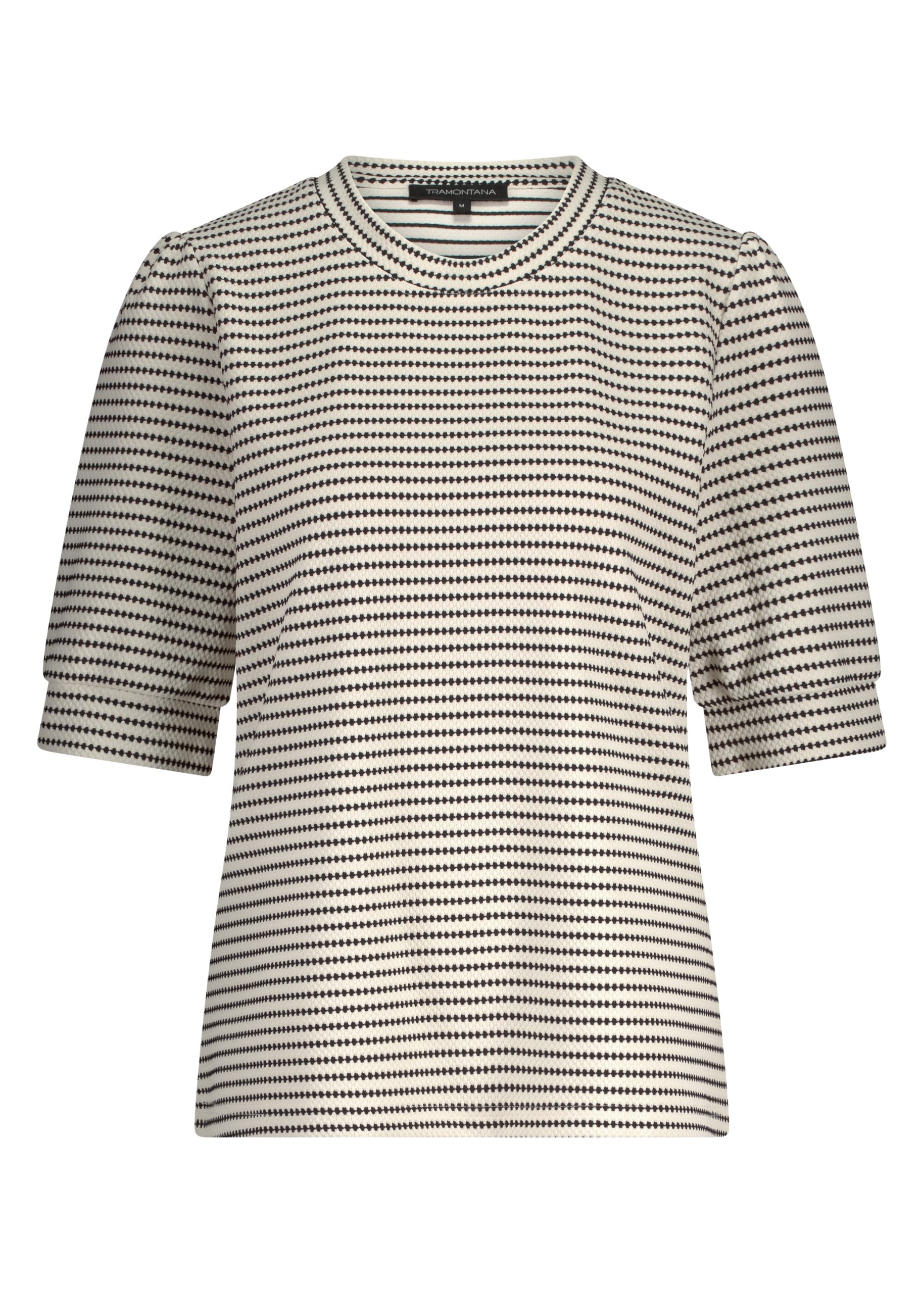 Gemaakt van een zachte mix van 70% polyester, 25% katoen en 5% elastaan, biedt deze top een lichte stretch en een prettige structuur die mooi in vorm blijft. De fijne streep geeft het ontwerp een frisse, casual uitstraling, terwijl de subtiele glans in de stof zorgt voor een verfijnd accent.