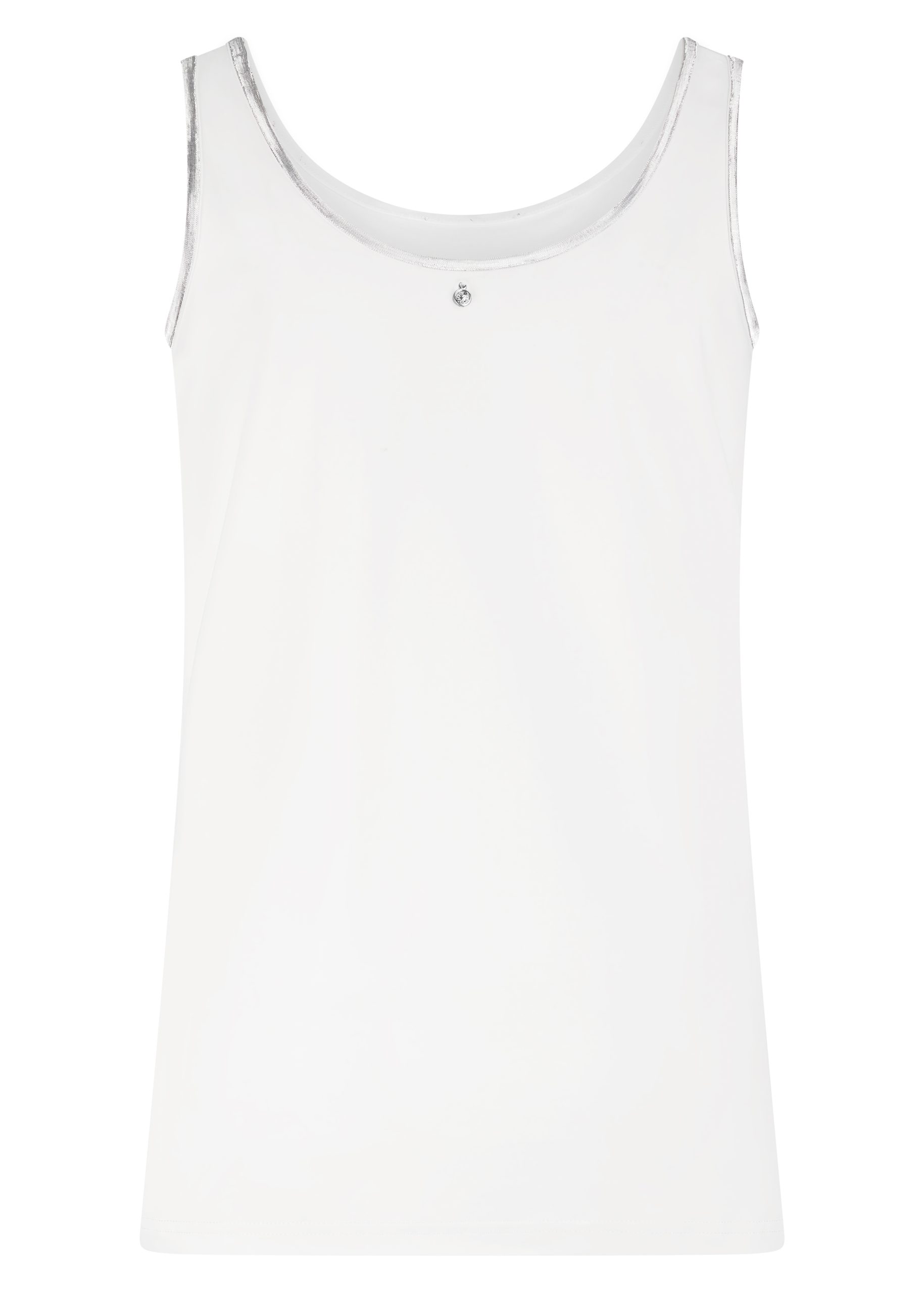 Deze singlet is gemaakt van een comfortabele en soepele stofmix van 85% polyamide en 15% elastaan, wat zorgt voor een zachte feel, optimale stretch en een mooi aansluitende pasvorm. De ronde hals en mouwloze snit vormen een tijdloze basis, terwijl de fijne lurex tape langs de hals- en armsgaten een subtiel glanzend accent toevoegt en het ontwerp net dat beetje extra geeft.