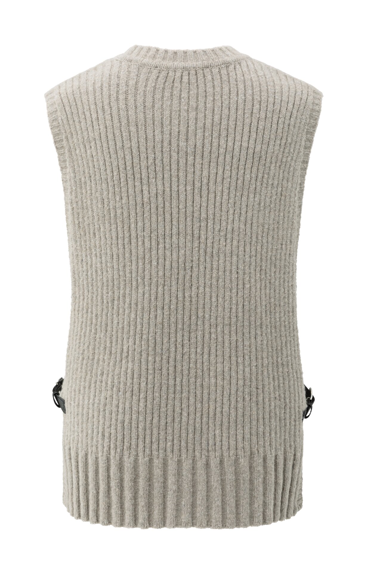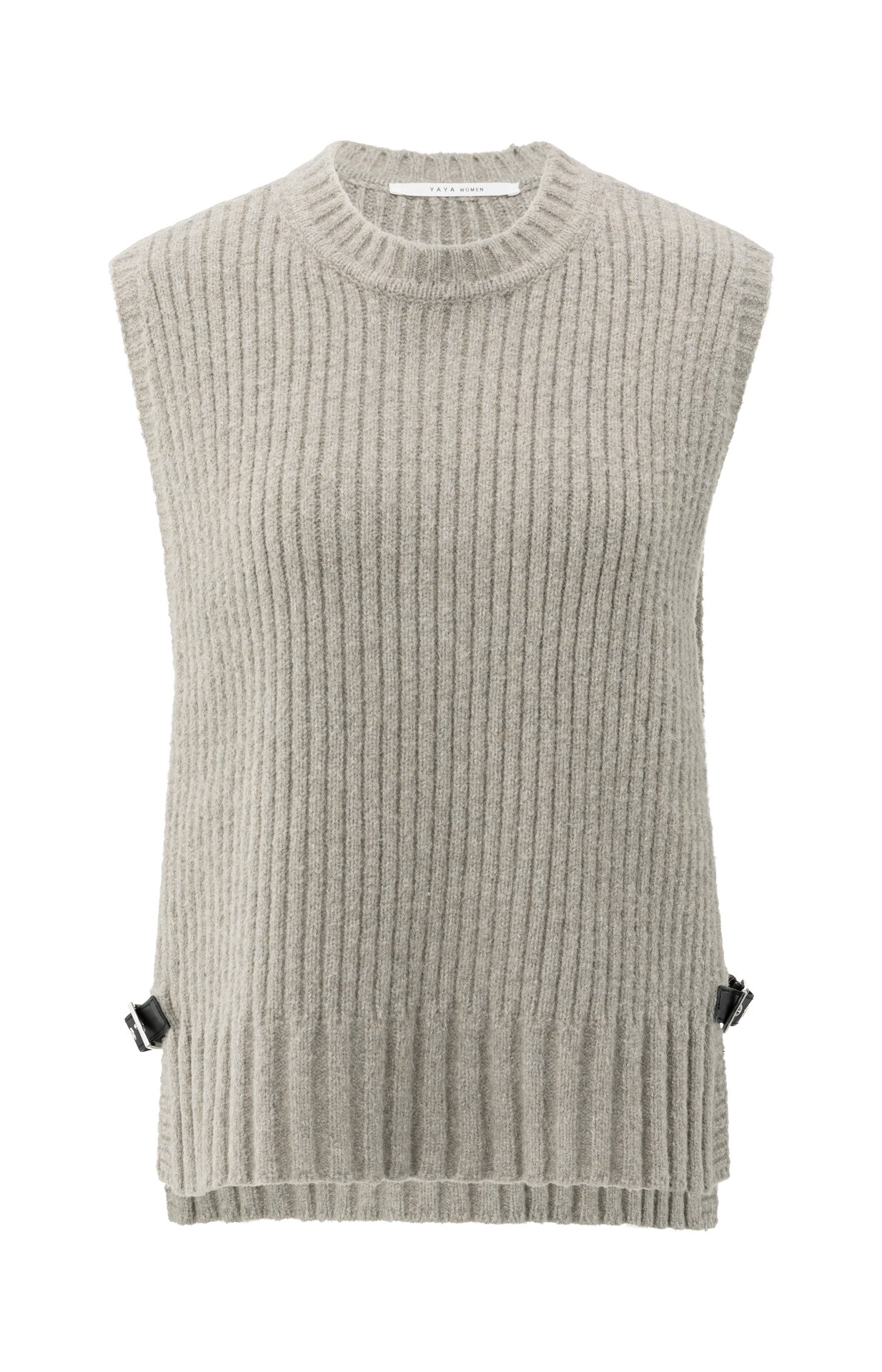 Deze grofgebreide spencer is uitgevoerd in een normale, iets langere pasvorm en heeft een ronde hals. De grove ribstructuur zorgt voor een warme, stoere uitstraling. De leren gespen aan de zijkanten geven het item een modern accent en maken het perfect om gelaagd te dragen over een blouse of coltrui